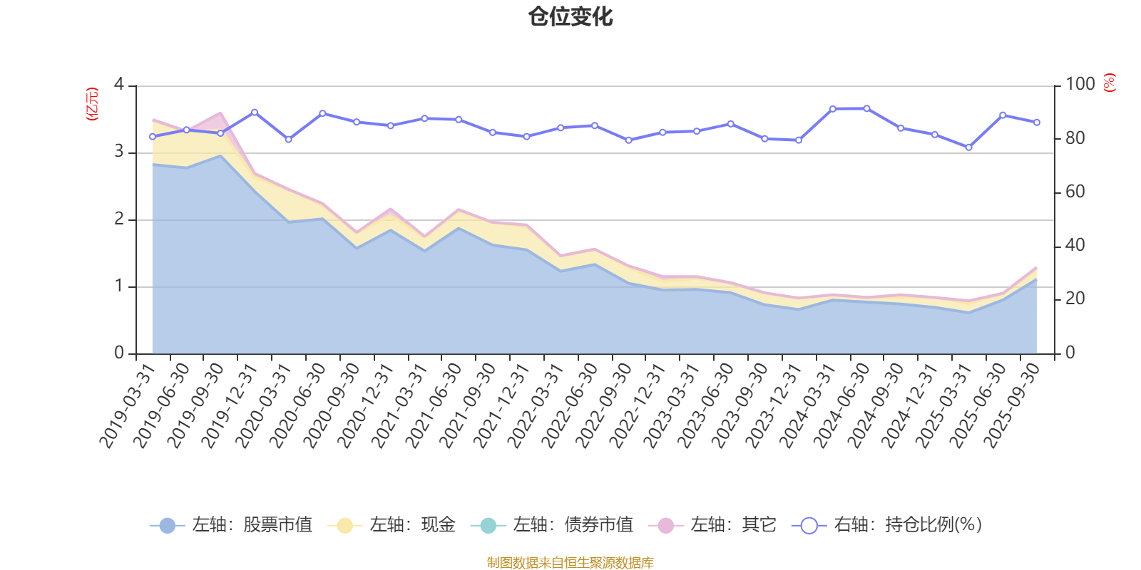 据定期报告数据统计,近三年平均股票仓位为84.31%,同类平均为72.35%。2024年上半年末基金达到91.44%的最高仓位,2025年一季度末最低,为76.94%。