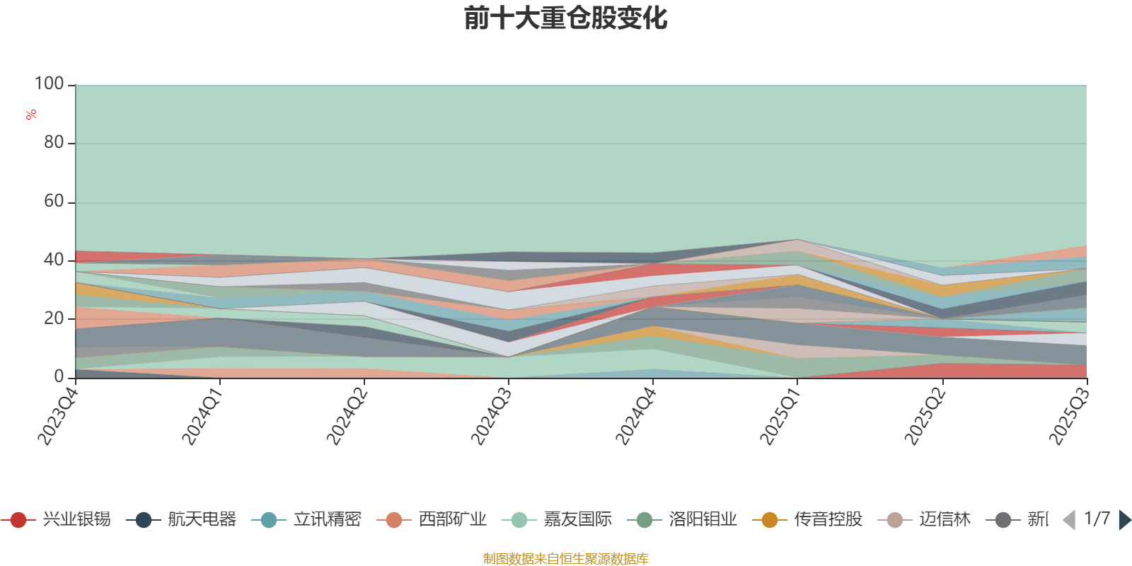 截至2025年三季度末,基金十大重仓股分别是紫金矿业、铜陵有色、恺英网络、兴业银锡、芒果超媒、亿纬锂能、佳驰科技、云铝股份、博实结、中金黄金。