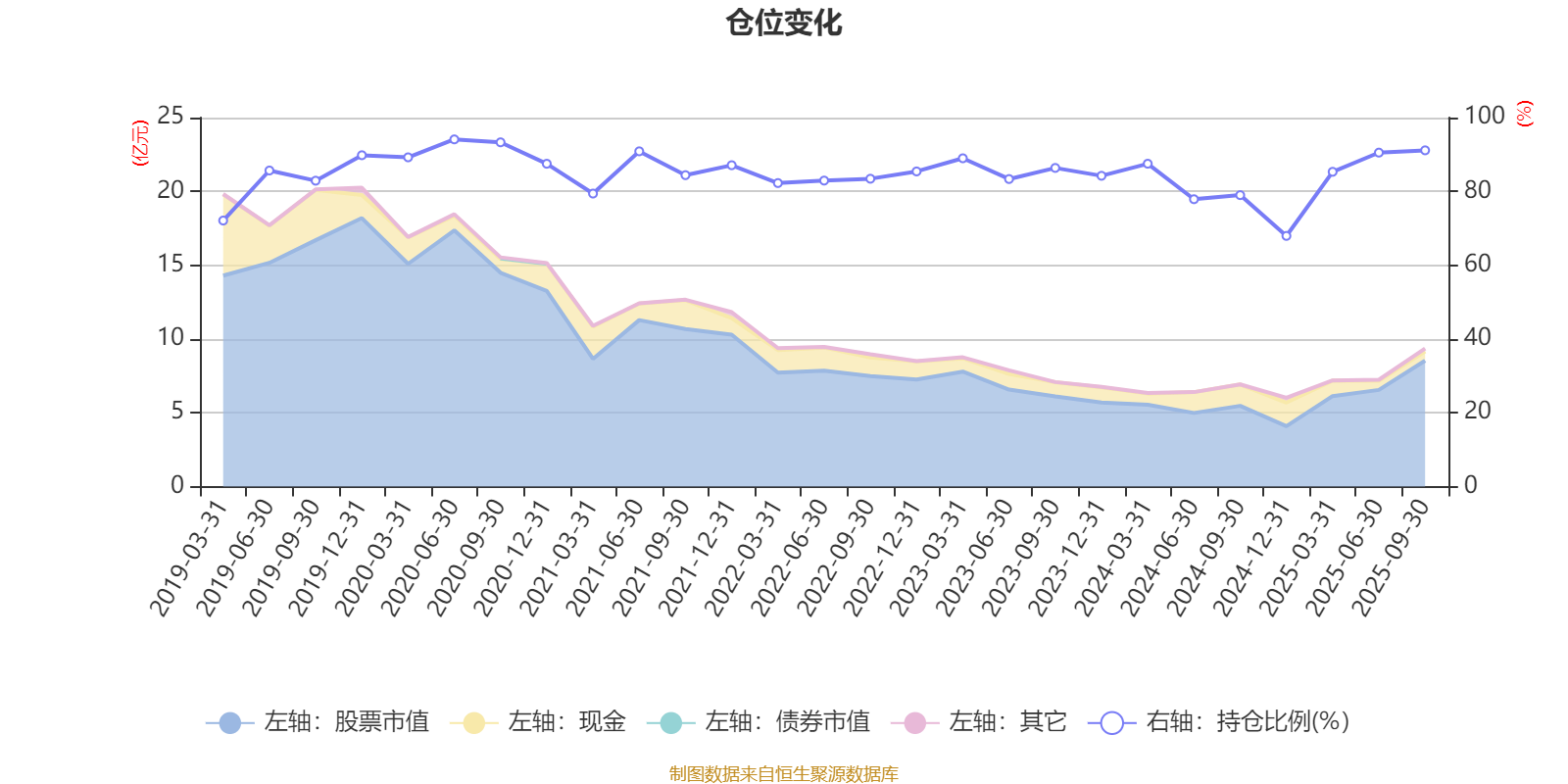 据定期报告数据统计,近三年平均股票仓位为83.97%,同类平均为72.35%。2020年上半年末基金达到94.1%的最高仓位,2024年末最低,为67.94%。