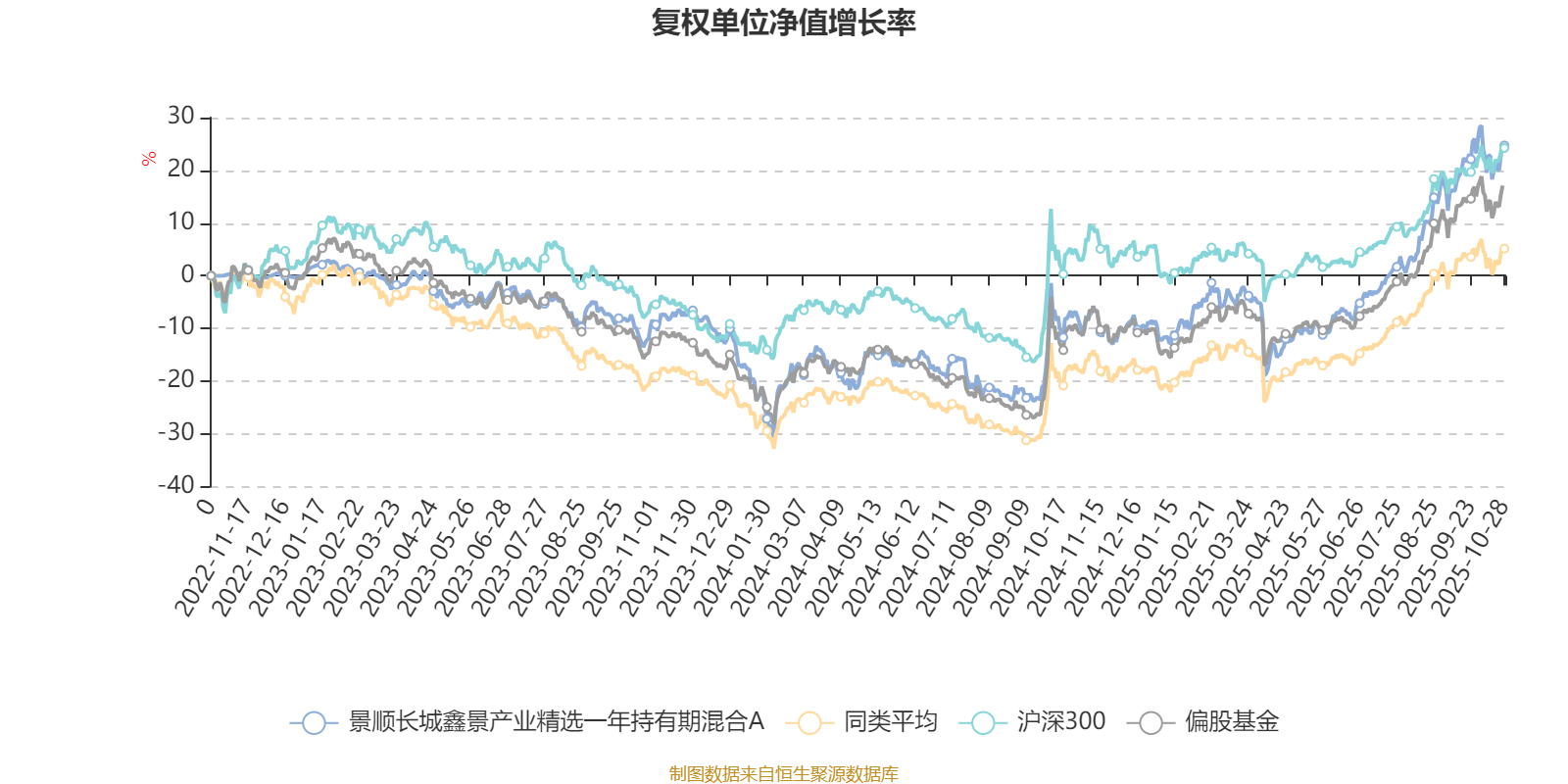 截至10月28日,景顺长城鑫景产业精选一年持有期混合A近三个月复权单位净值增长率为22.05%,位于同类可比基金151/689;近半年复权单位净值增长率为42.30%,位于同类可比基金133/688;近一年复权单位净值增长率为33.91%,位于同类可比基金203/653;近三年复权单位净值增长率为24.68%,位于同类可比基金133/364。