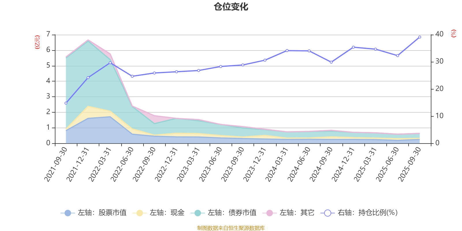 据定期报告数据统计,近三年平均股票仓位为31.7%,同类平均为19.14%。2025年三季度末基金达到39.12%的最高仓位,2021年三季度末最低,为14.81%。