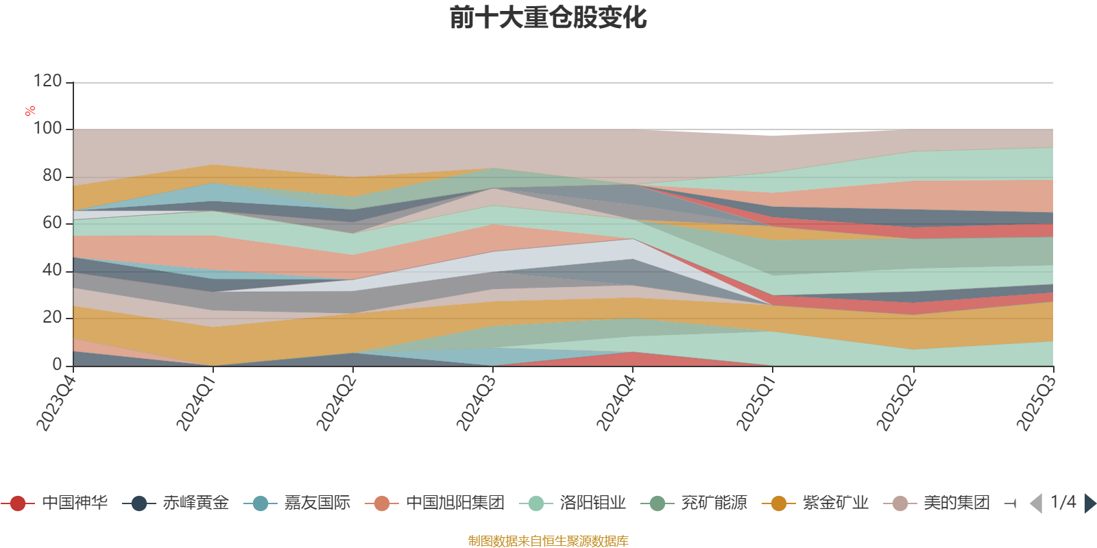该基金持股集中度较高,近2年前十大重仓股集中度长期超过60%。截至2025年三季度末,基金十大重仓股分别是紫金矿业、株冶集团、金诚信、湖南黄金、洛阳钼业、中国海洋石油、中矿资源、五矿资源、金川国际、中国国航。