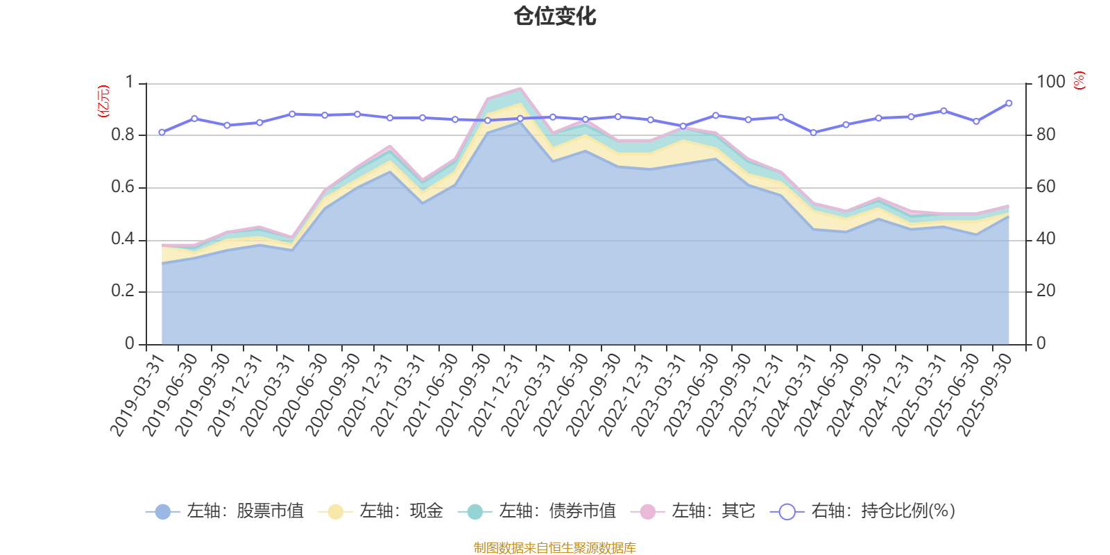 据定期报告数据统计,近三年平均股票仓位为86.39%,同类平均为83.73%。2025年三季度末基金达到92.38%的最高仓位,2024年一季度末最低,为81.1%。