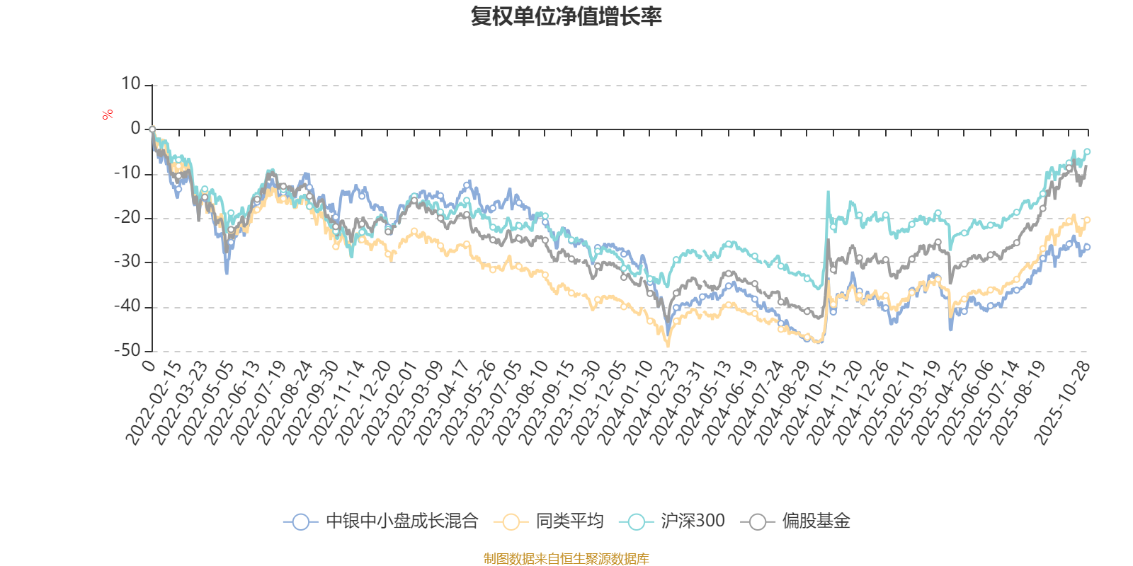截至10月28日,中银中小盘成长混合近三个月复权单位净值增长率为12.12%,位于同类可比基金370/689;近半年复权单位净值增长率为25.11%,位于同类可比基金383/688;近一年复权单位净值增长率为16.03%,位于同类可比基金477/653;近三年复权单位净值增长率为-11.86%,位于同类可比基金312/364。