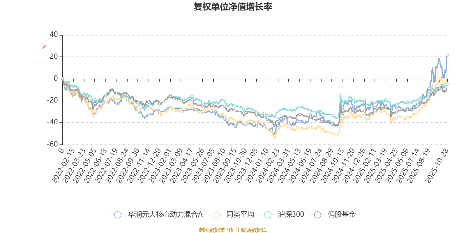 截至10月28日,华润元大核心动力混合A近三个月复权单位净值增长率为44.90%,位于同类可比基金70/229;近半年复权单位净值增长率为66.34%,位于同类可比基金79/229;近一年复权单位净值增长率为57.54%,位于同类可比基金97/213;近三年复权单位净值增长率为88.93%,位于同类可比基金28/158。