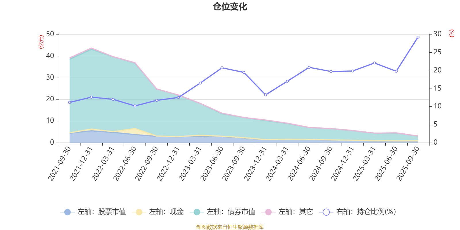 据定期报告数据统计,近三年平均股票仓位为19.29%,同类平均为19.14%。2025年三季度末基金达到29.29%的最高仓位,2022年上半年末最低,为10.21%。