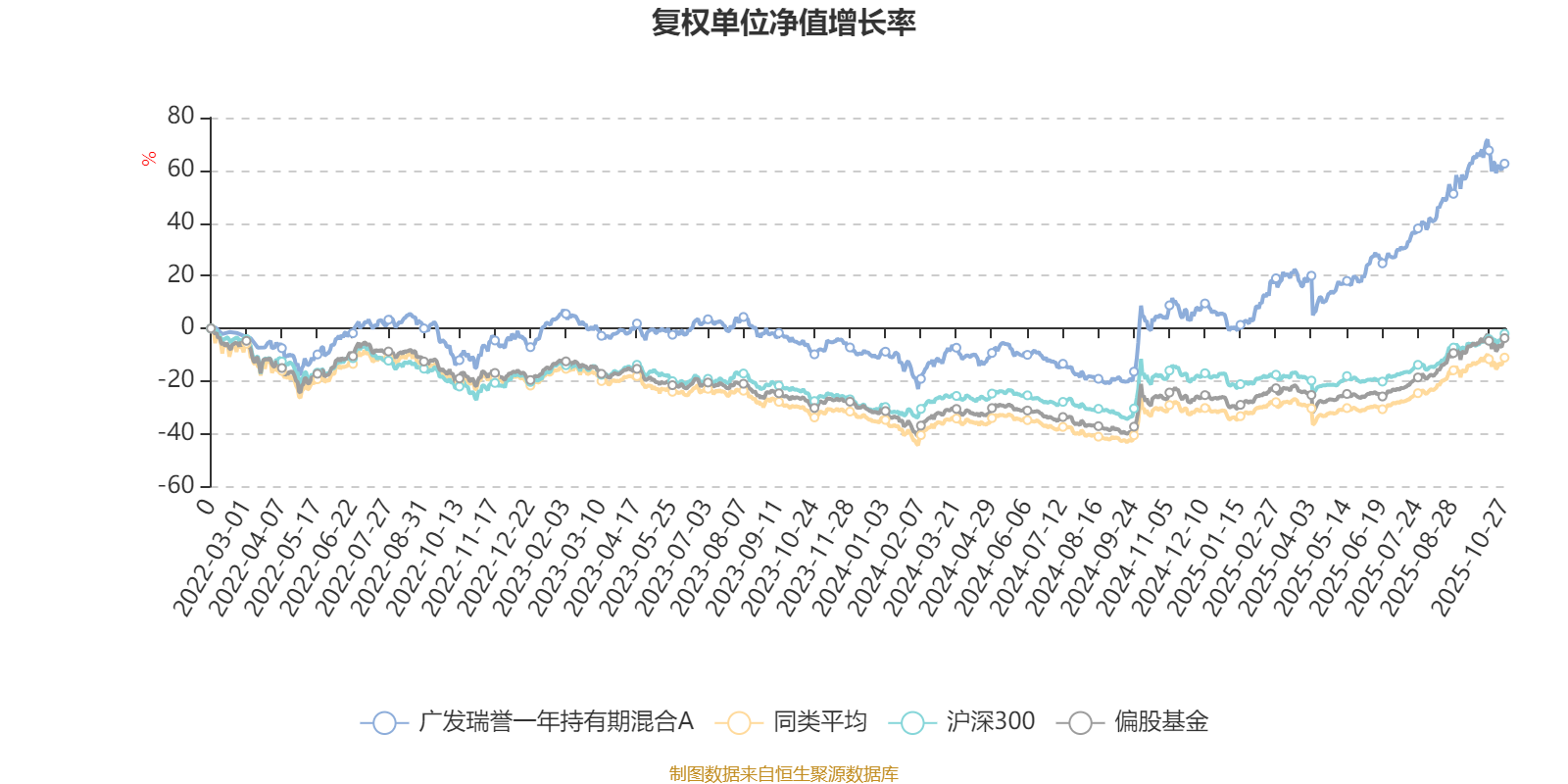 截至10月27日,广发瑞誉一年持有期混合A近三个月复权单位净值增长率为18.39%,位于同类可比基金67/185;近半年复权单位净值增长率为43.32%,位于同类可比基金36/185;近一年复权单位净值增长率为54.87%,位于同类可比基金15/181;近三年复权单位净值增长率为83.41%,位于同类可比基金7/175。