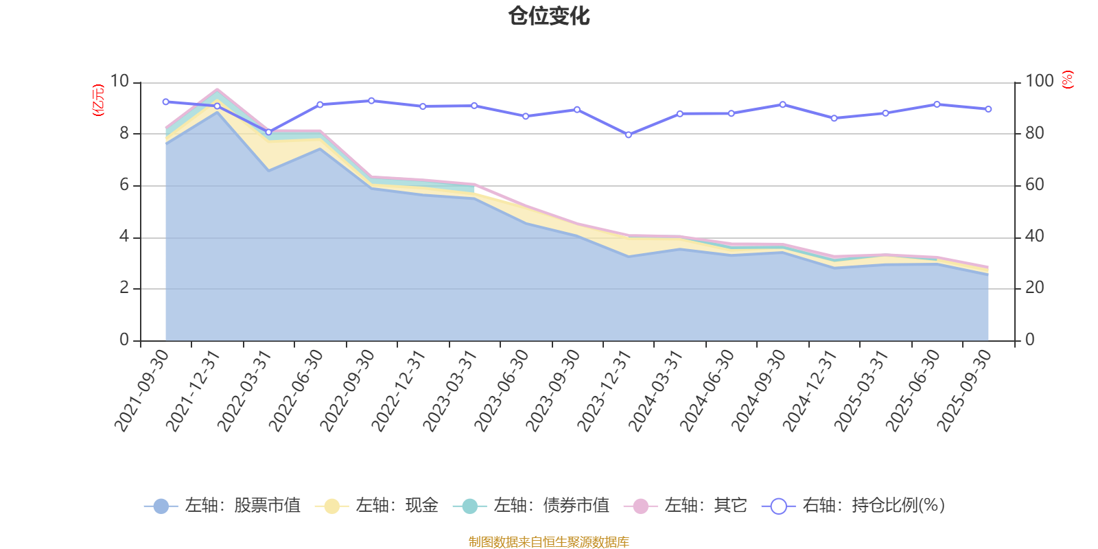 据定期报告数据统计,近三年平均股票仓位为88.36%,同类平均为85.66%。2022年三季度末基金达到92.9%的最高仓位,2023年末最低,为79.71%。