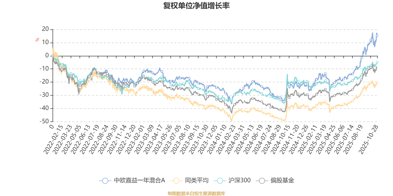 截至10月28日,中欧嘉益一年混合A近三个月复权单位净值增长率为26.91%,位于同类可比基金106/621;近半年复权单位净值增长率为44.28%,位于同类可比基金112/619;近一年复权单位净值增长率为48.87%,位于同类可比基金112/611;近三年复权单位净值增长率为46.96%,位于同类可比基金90/518。