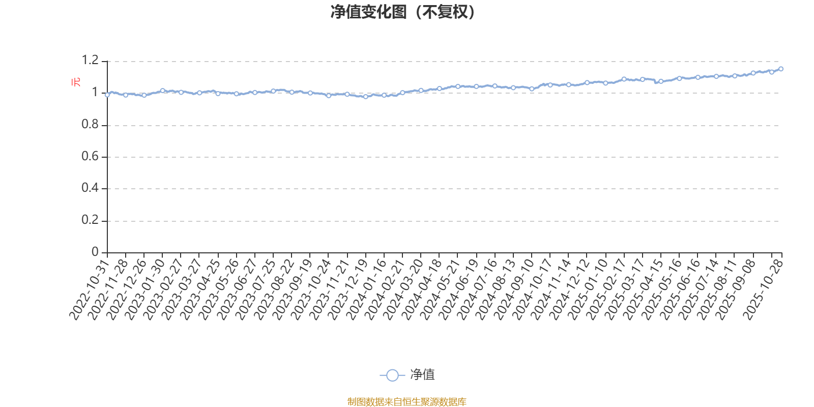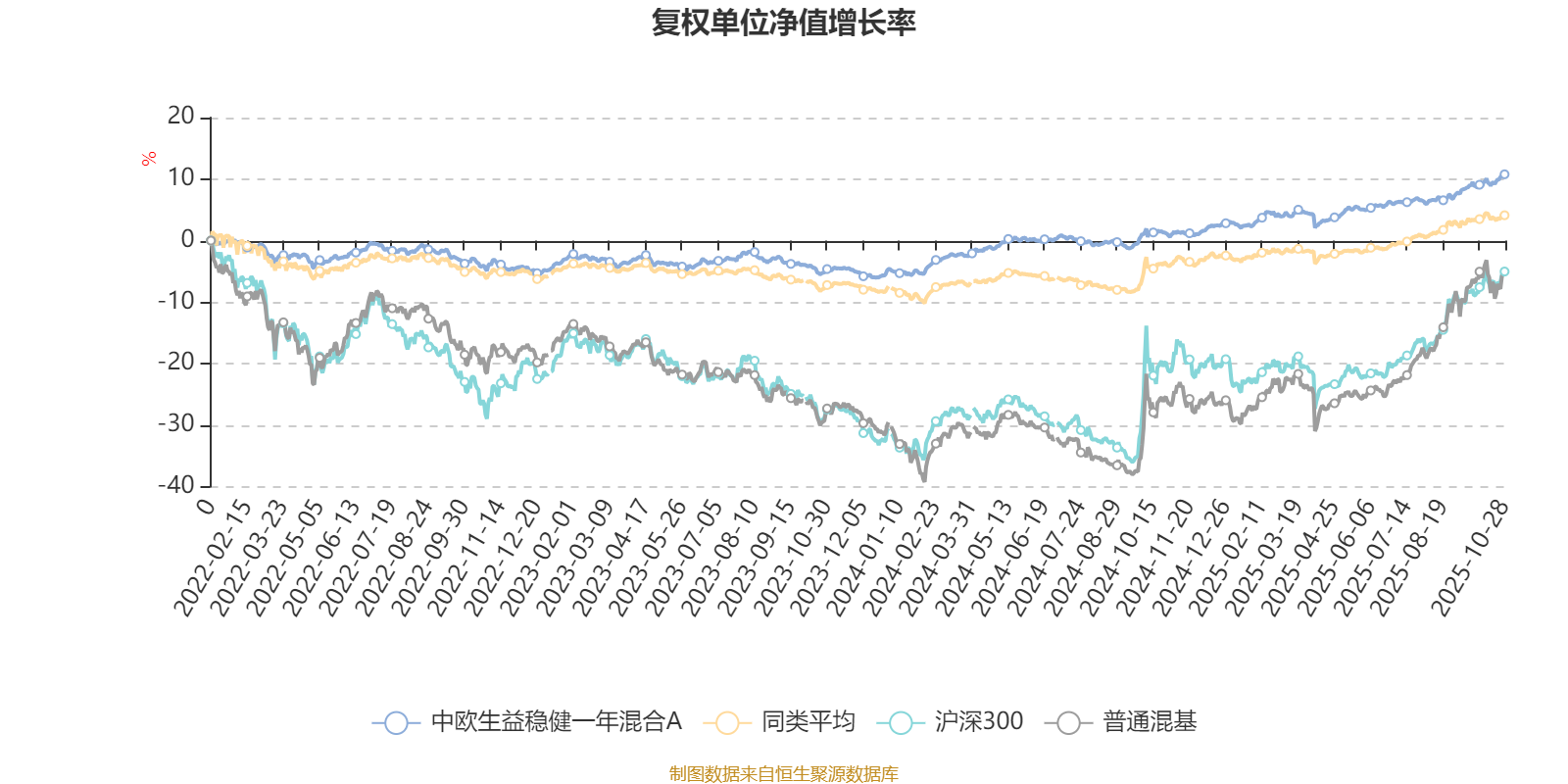 该基金属于偏债混合型基金。截至10月28日,单位净值为1.151元。基金经理是黄华,目前管理的8只基金近一年均为正收益。其中,截至10月28日,中欧生益稳健一年混合A近一年复权单位净值增长率最高,达9.46%;中欧琪和灵活配置混合A最低,为4.63%。