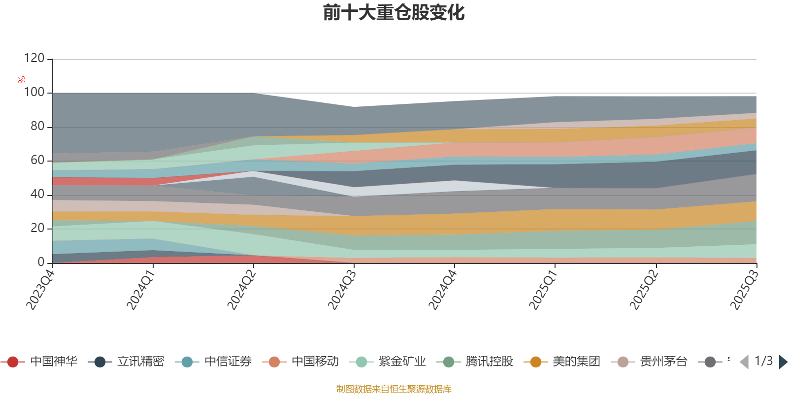该基金持股集中度较高,近2年前十大重仓股集中度长期超过60%。截至2025年三季度末,基金十大重仓股分别是宁德时代、工商银行、腾讯控股、美的集团、农业银行、紫金矿业、阿里巴巴-W、中国海油、中国电信、中国移动。