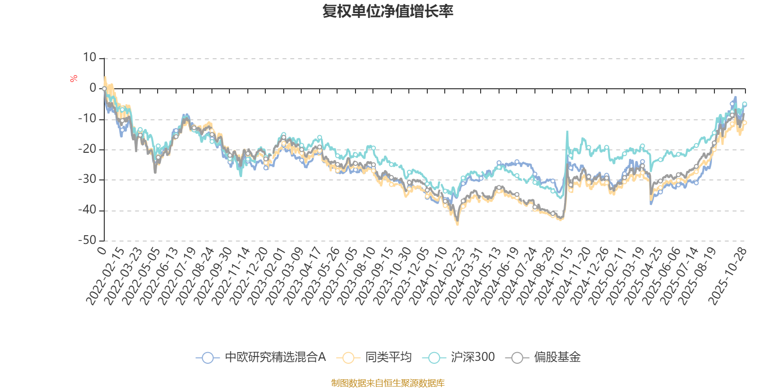 截至10月28日,中欧研究精选混合A近三个月复权单位净值增长率为29.48%,位于同类可比基金36/265;近半年复权单位净值增长率为43.09%,位于同类可比基金53/265;近一年复权单位净值增长率为27.68%,位于同类可比基金127/265;近三年复权单位净值增长率为29.22%,位于同类可比基金95/253。