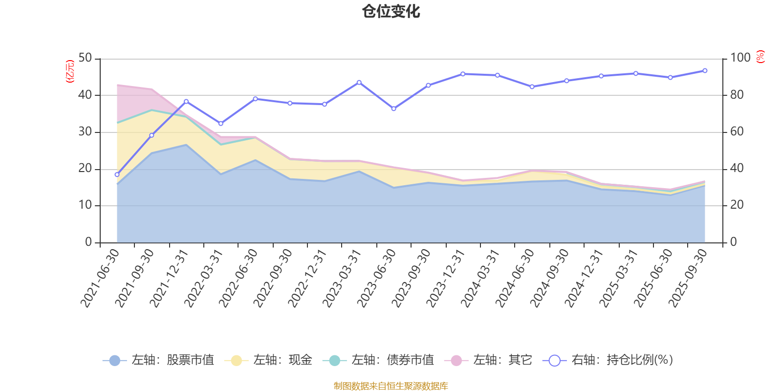 据定期报告数据统计,近三年平均股票仓位为86.82%,同类平均为85.99%。2025年三季度末基金达到93.5%的最高仓位,2021年上半年末最低,为37.01%。