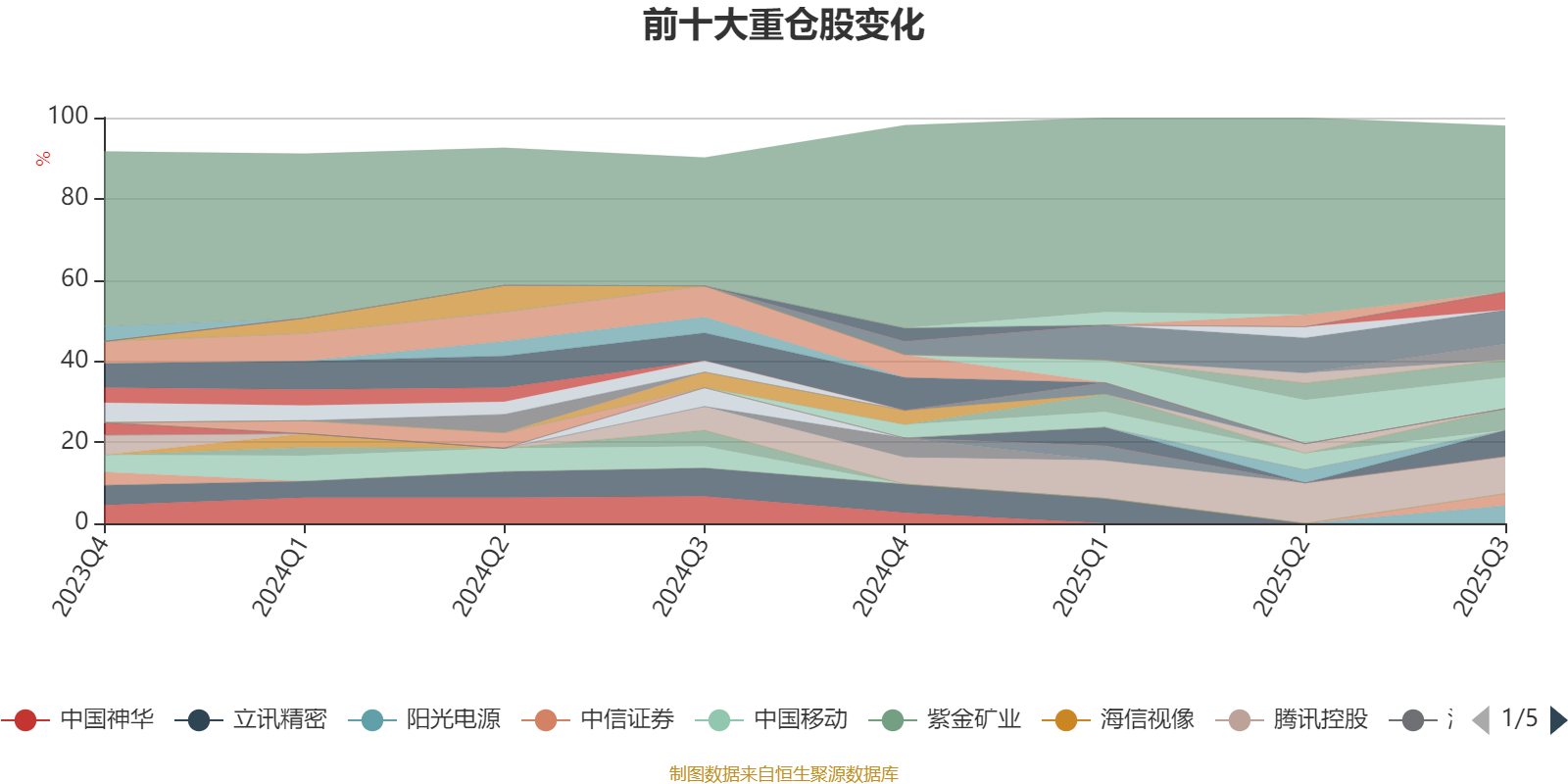 该基金持股集中度较高。截至2025年三季度末,基金十大重仓股分别是腾讯控股、阿里巴巴-W、小米集团-W、宁德时代、香港交易所、工业富联、阳光电源、中芯国际、亿纬锂能、中信证券。