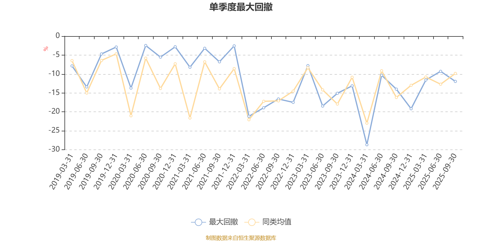 截至10月28日,基金近三年最大回撤为44.16%,同类可比基金排名86/159。单季度最大回撤出现在2024年一季度,为28.72%。