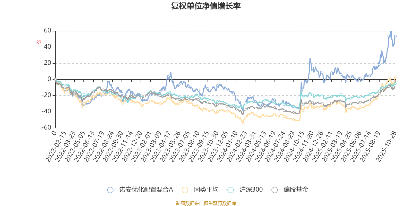 截至10月28日,诺安优化配置混合A近三个月复权单位净值增长率为34.61%,位于同类可比基金119/229;近半年复权单位净值增长率为49.95%,位于同类可比基金118/229;近一年复权单位净值增长率为57.86%,位于同类可比基金95/213;近三年复权单位净值增长率为81.26%,位于同类可比基金36/158。