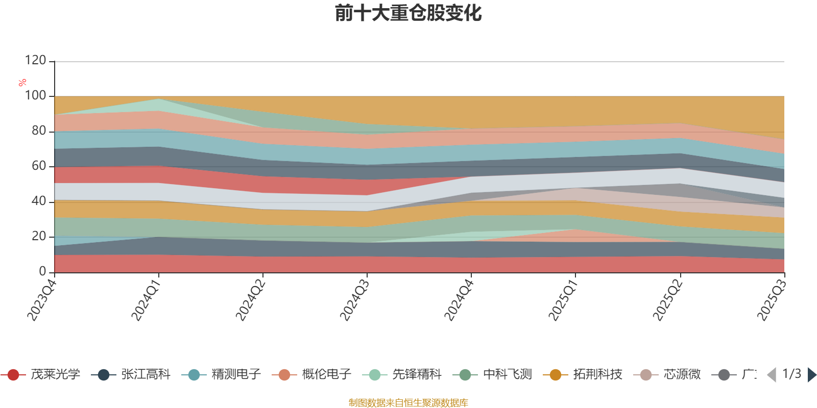 该基金持股集中度较高,且持股标的较为稳定,近2年前十大重仓股集中度长期超过60%。截至2025年三季度末,基金十大重仓股分别是中芯国际、拓荆科技、中科飞测、中微公司、北方华创、华大九天、茂莱光学、张江高科、芯源微、沪硅产业。