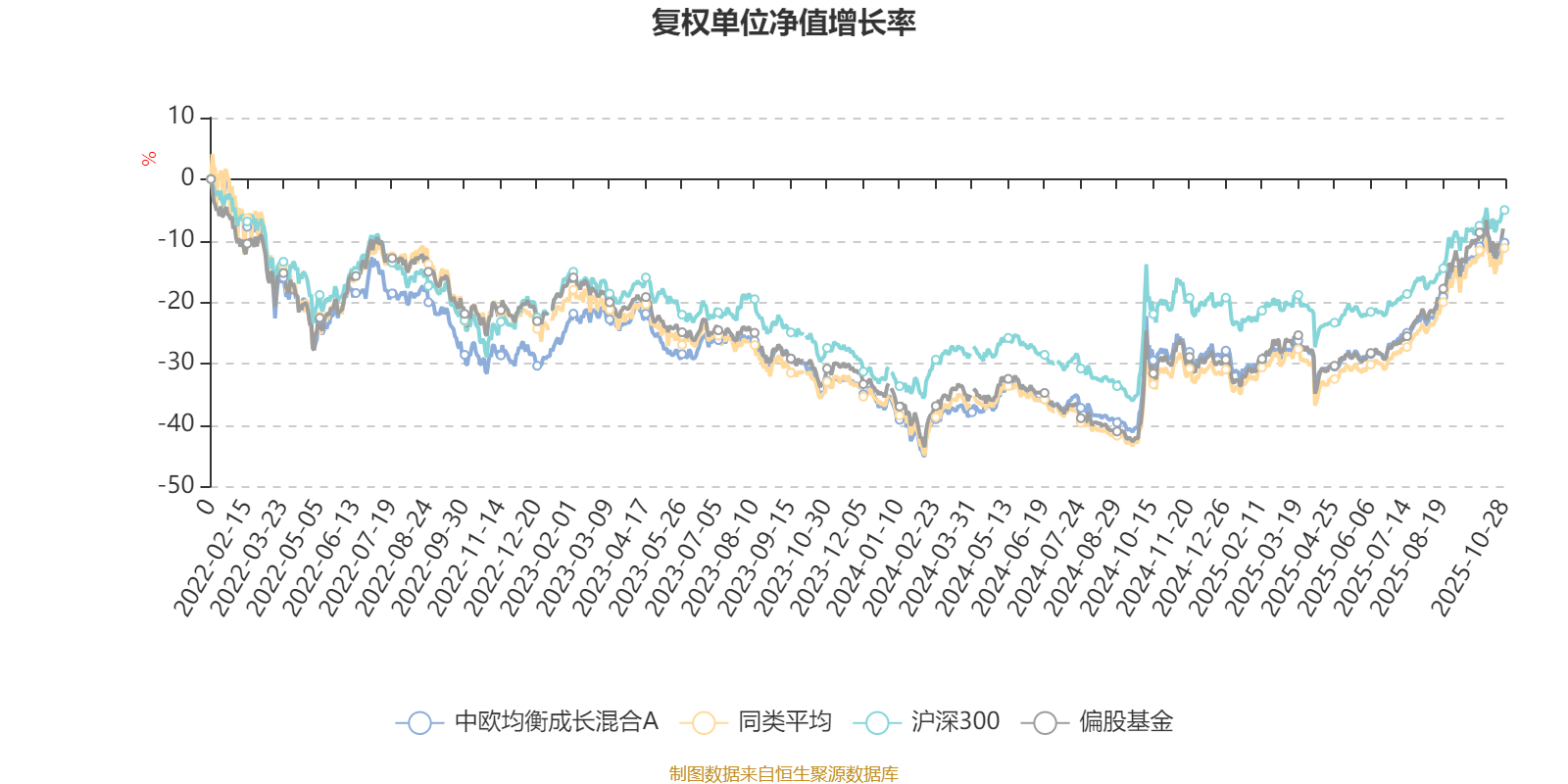 截至10月28日,中欧均衡成长混合A近三个月复权单位净值增长率为15.93%,位于同类可比基金112/265;近半年复权单位净值增长率为28.94%,位于同类可比基金133/265;近一年复权单位净值增长率为24.01%,位于同类可比基金153/265;近三年复权单位净值增长率为30.50%,位于同类可比基金89/253。