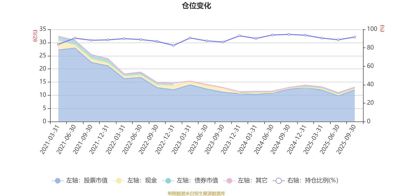 据定期报告数据统计,近三年平均股票仓位为90.32%,同类平均为85.99%。2024年三季度末基金达到94.58%的最高仓位,2022年末最低,为82.66%。