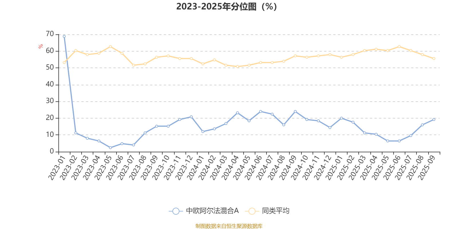 通过所选区间该基金净值增长率分位图,可以观察该基金与同类基金业绩比较情况。图为坐标原点到区间内某时点的净值增长率在同类基金中的分位数。