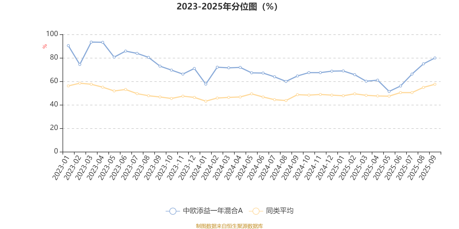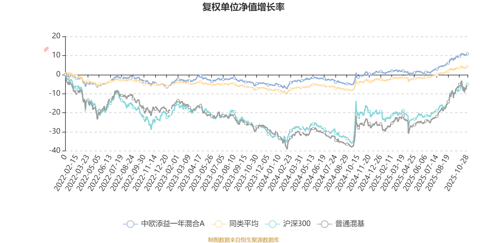 截至10月28日,中欧添益一年混合A近三个月复权单位净值增长率为6.05%,位于同类可比基金67/629;近半年复权单位净值增长率为9.92%,位于同类可比基金98/629;近一年复权单位净值增长率为11.17%,位于同类可比基金107/623;近三年复权单位净值增长率为17.20%,位于同类可比基金129/557。