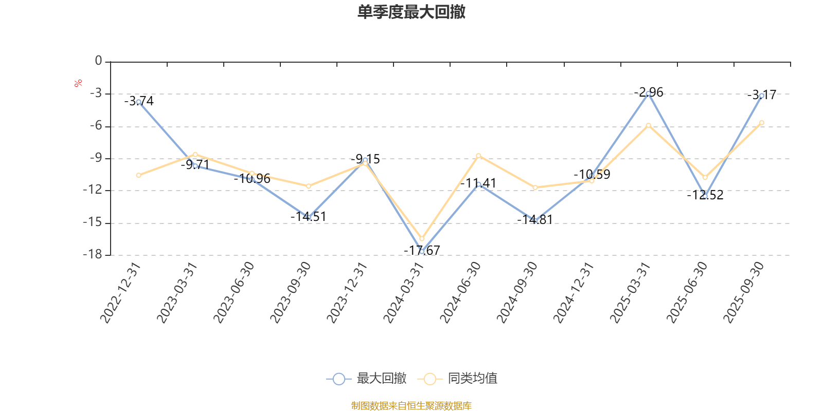 截至10月28日,基金近三年最大回撤为43.71%,同类可比基金排名416/513。单季度最大回撤出现在2024年一季度,为17.67%。