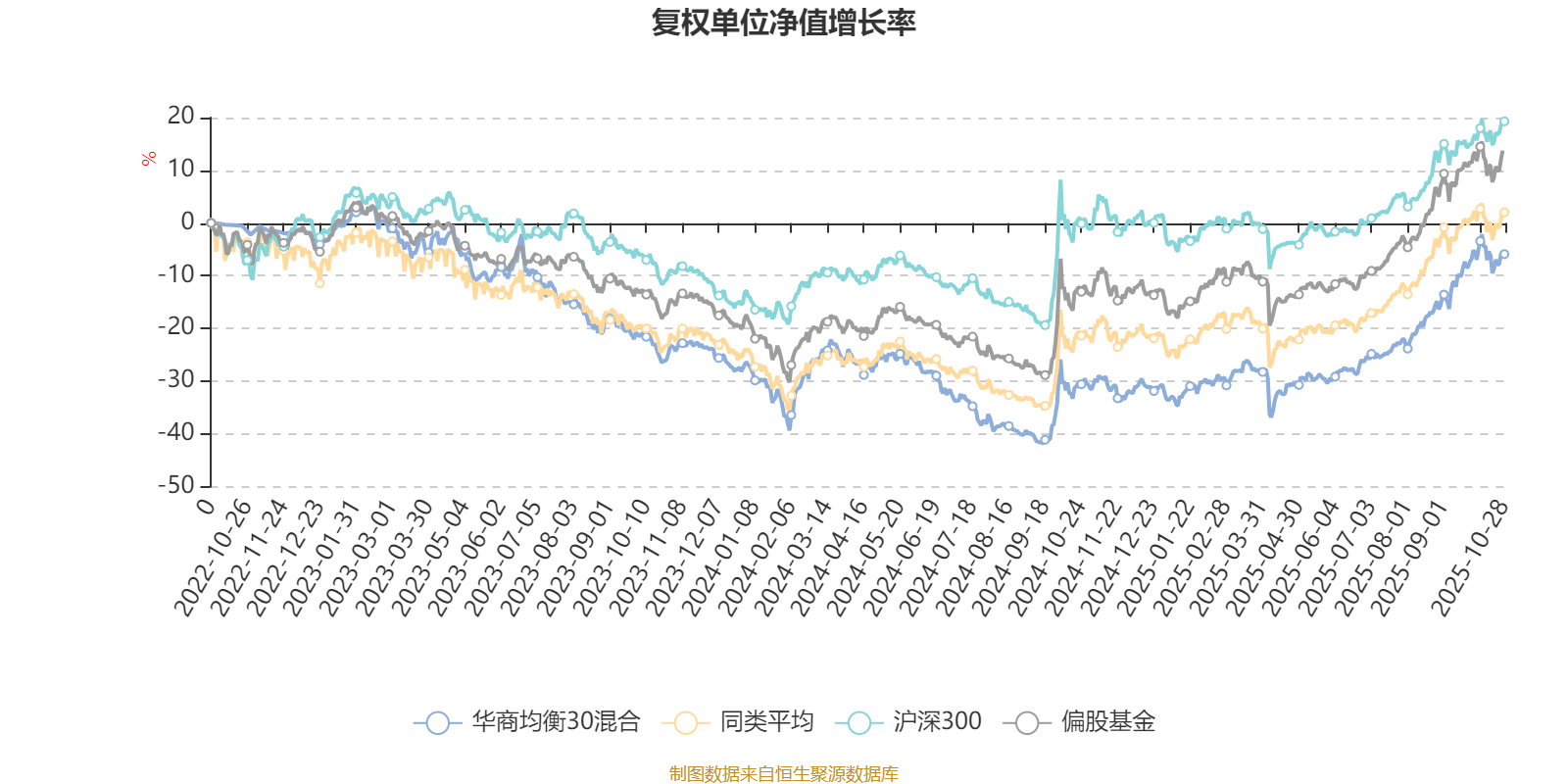 截至10月28日,华商均衡30混合近三个月复权单位净值增长率为21.67%,位于同类可比基金166/621;近半年复权单位净值增长率为35.88%,位于同类可比基金202/619;近一年复权单位净值增长率为33.48%,位于同类可比基金235/611;近三年复权单位净值增长率为-3.76%,位于同类可比基金448/518。