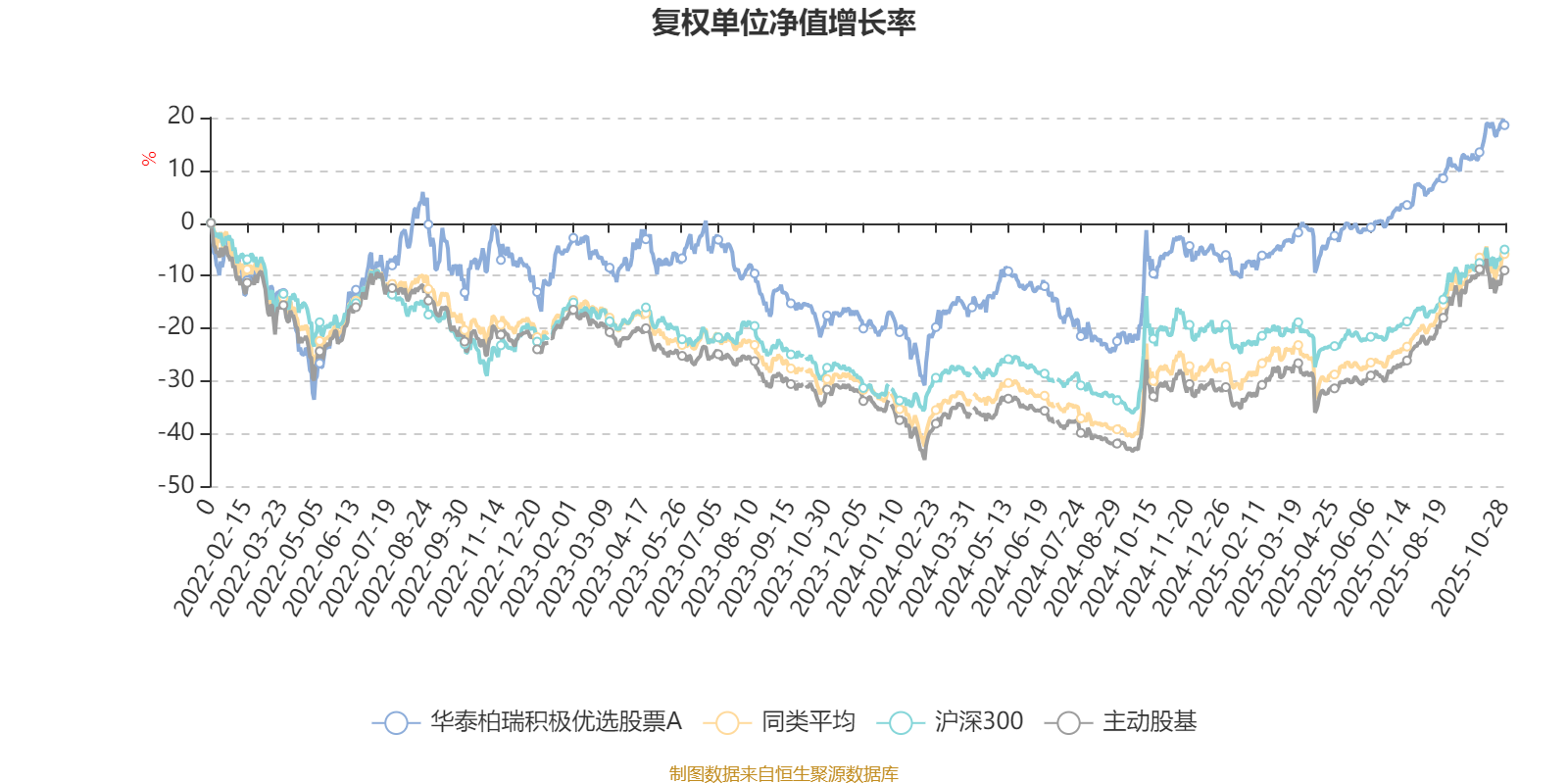 截至10月28日,华泰柏瑞积极优选股票A近三个月复权单位净值增长率为10.79%,位于同类可比基金118/167;近半年复权单位净值增长率为21.79%,位于同类可比基金123/166;近一年复权单位净值增长率为25.77%,位于同类可比基金95/164;近三年复权单位净值增长率为30.63%,位于同类可比基金65/156。