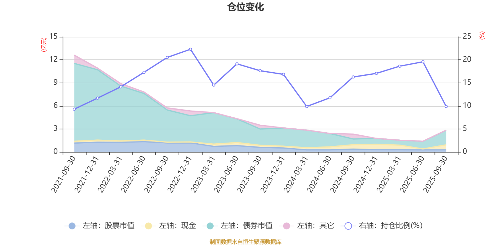 据定期报告数据统计,近三年平均股票仓位为16.12%,同类平均为19.14%。2022年末基金达到22.29%的最高仓位,2021年三季度末最低,为9.3%。