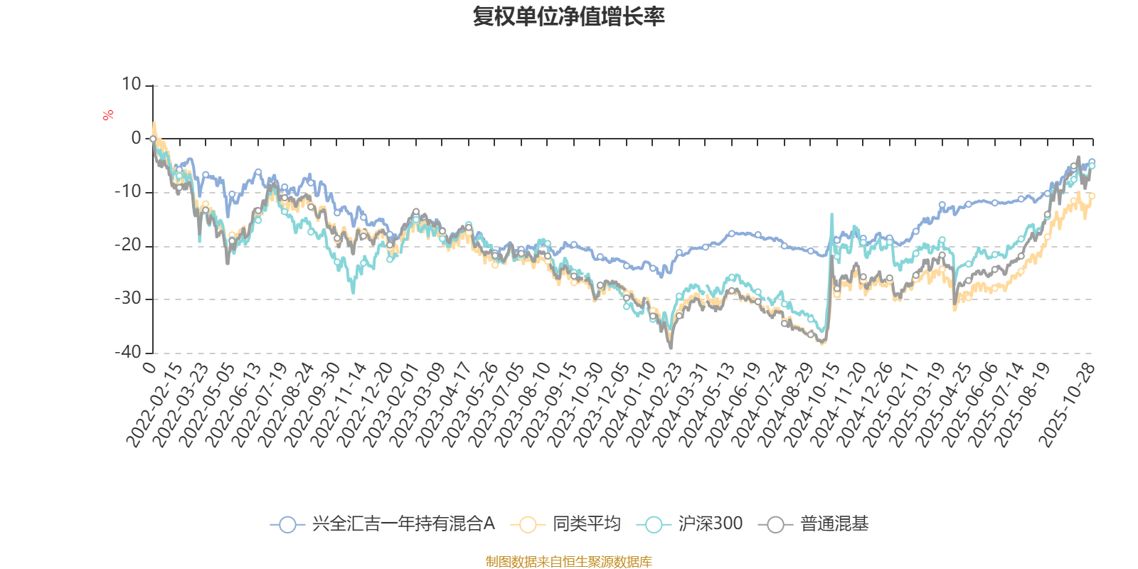 截至10月28日,兴全汇吉一年持有混合A近三个月复权单位净值增长率为7.57%,位于同类可比基金86/134;近半年复权单位净值增长率为8.93%,位于同类可比基金112/134;近一年复权单位净值增长率为16.48%,位于同类可比基金73/130;近三年复权单位净值增长率为13.14%,位于同类可比基金76/119。