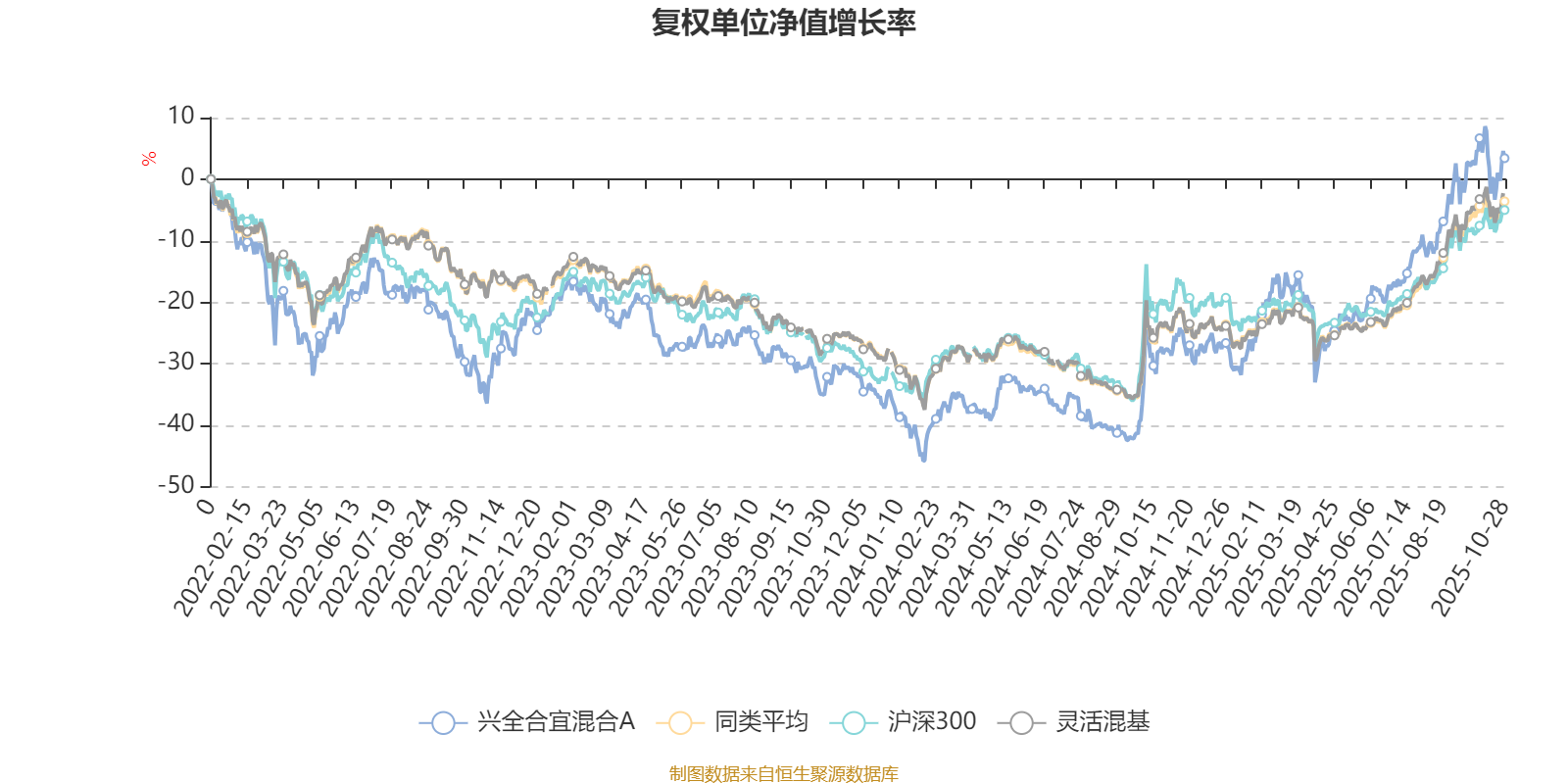 截至10月28日,兴全合宜混合A近三个月复权单位净值增长率为15.54%,位于同类可比基金484/1287;近半年复权单位净值增长率为37.28%,位于同类可比基金324/1287;近一年复权单位净值增长率为43.11%,位于同类可比基金215/1287;近三年复权单位净值增长率为60.85%,位于同类可比基金101/1286。