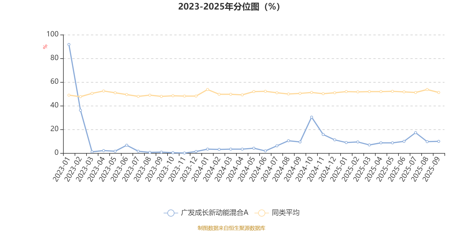 通过所选区间该基金净值增长率分位图,可以观察该基金与同类基金业绩比较情况。图为坐标原点到区间内某时点的净值增长率在同类基金中的分位数。
