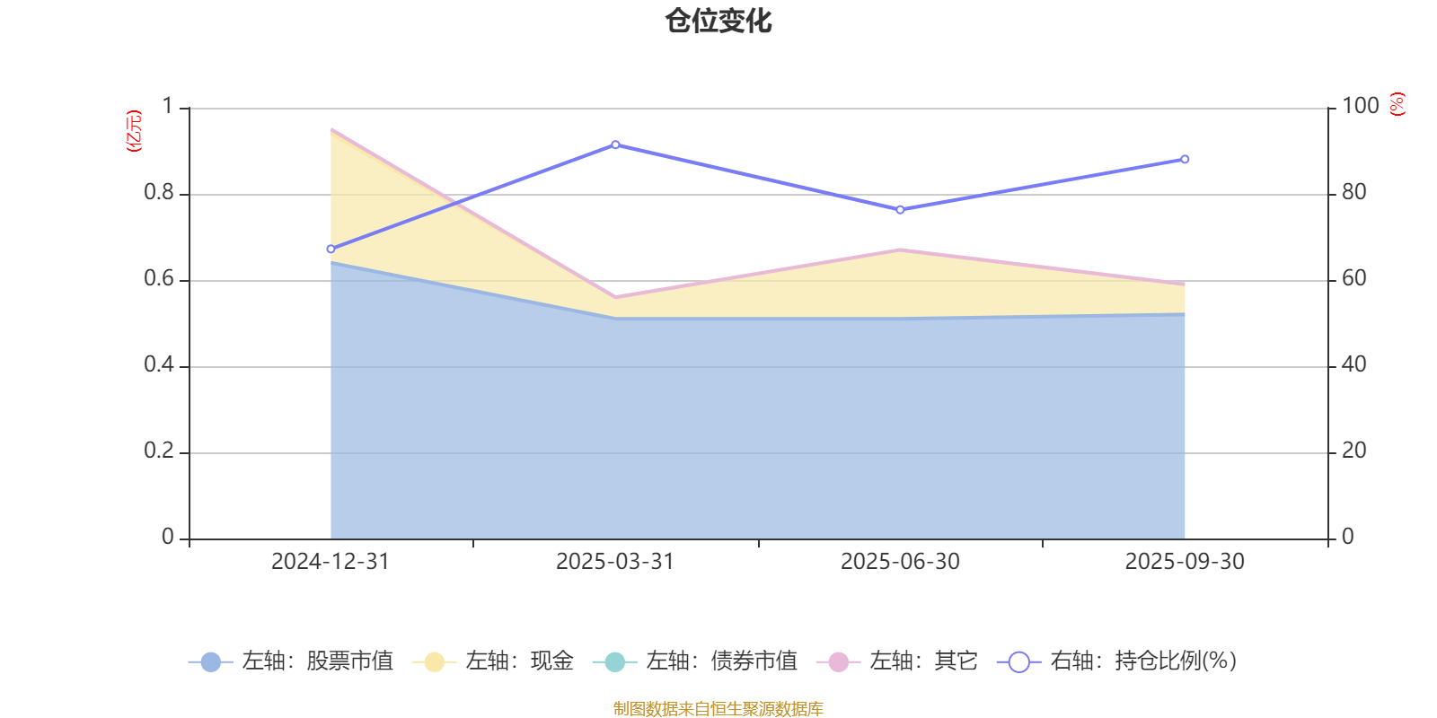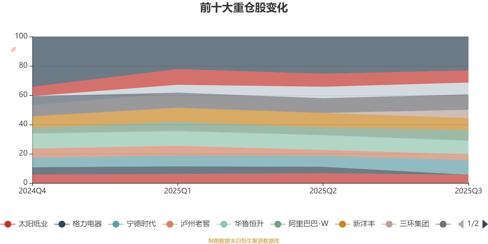 该基金持股集中度较高,且持股标的较为稳定。截至2025年三季度末,基金十大重仓股分别是腾讯控股、宁德时代、华鲁恒升、贵州茅台、史丹利、新洋丰、阿里巴巴-W、三环集团、太阳纸业、泸州老窖。
