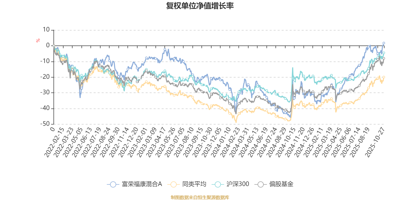 截至10月27日,富荣福康混合A近三个月复权单位净值增长率为11.94%,位于同类可比基金402/689;近半年复权单位净值增长率为40.46%,位于同类可比基金158/688;近一年复权单位净值增长率为43.07%,位于同类可比基金135/653;近三年复权单位净值增长率为25.37%,位于同类可比基金111/364。