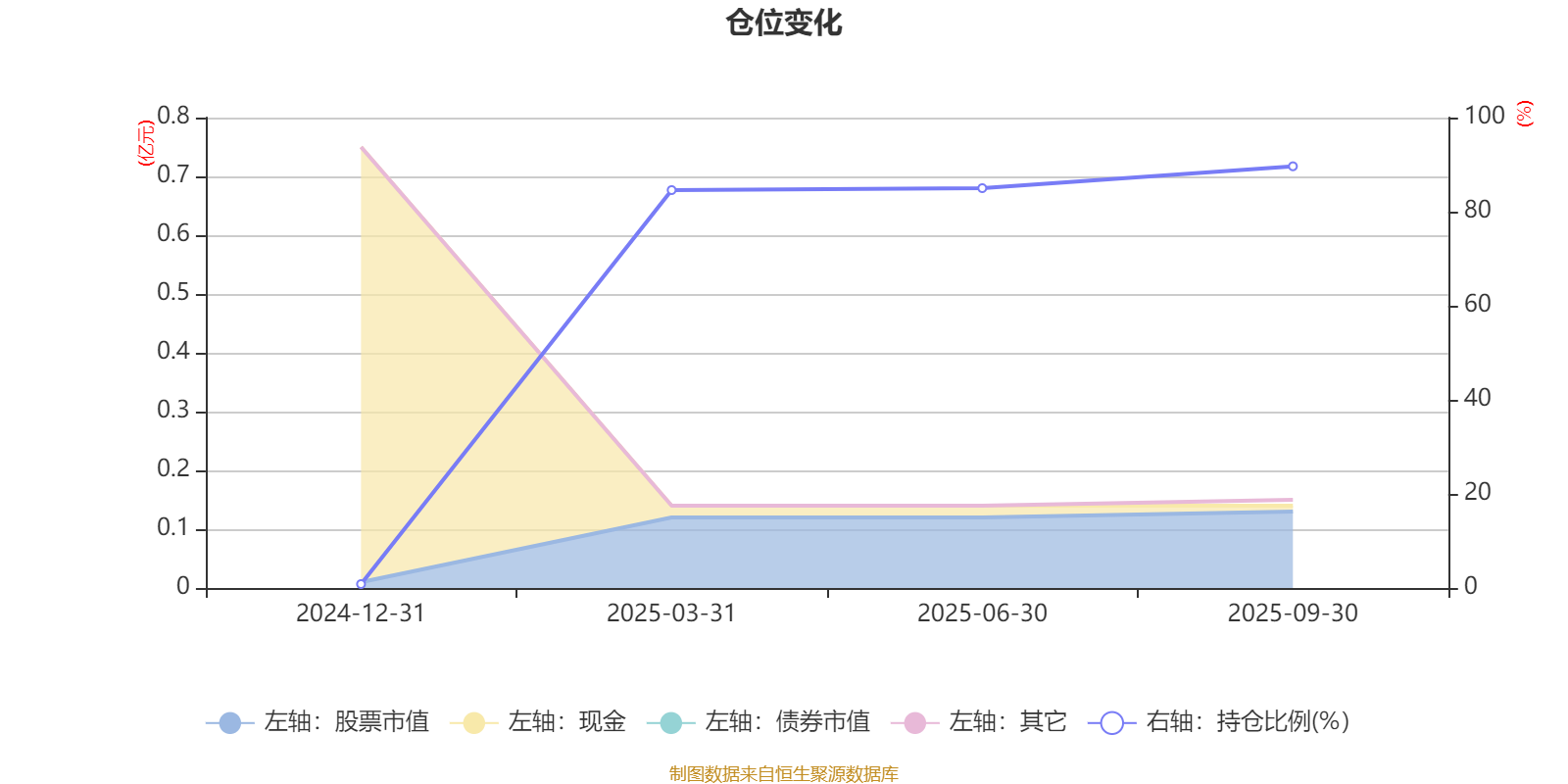据定期报告数据统计,成立以来平均股票仓位为65.02%,同类平均为83.73%。2025年三季度末基金达到89.65%的最高仓位,2024年末最低,为0.83%。