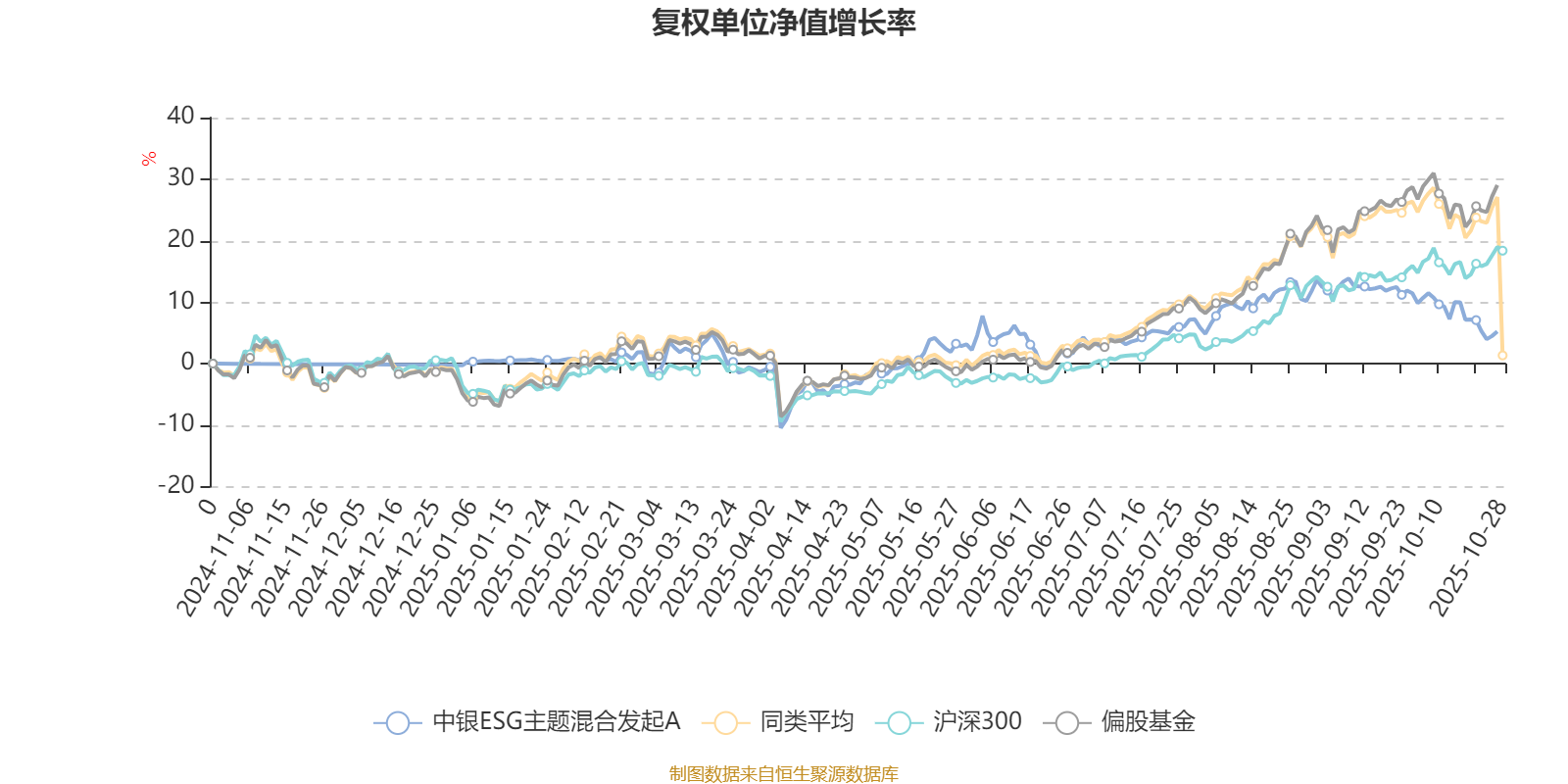 截至10月27日,中银ESG主题混合发起A近三个月复权单位净值增长率为-0.69%,位于同类可比基金670/689;近半年复权单位净值增长率为8.56%,位于同类可比基金648/688。