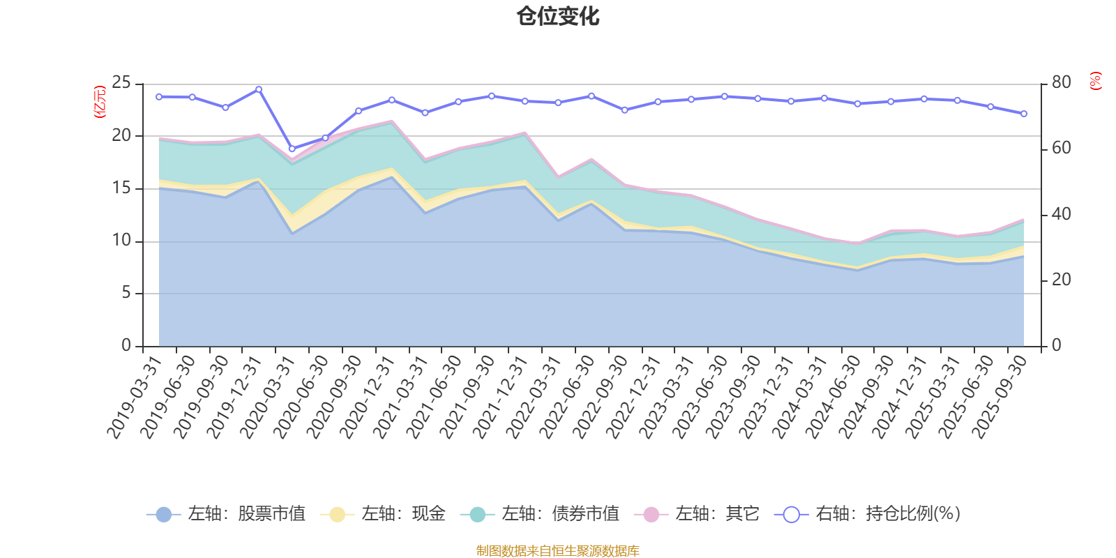 据定期报告数据统计,近三年平均股票仓位为74.52%,同类平均为72.35%。2019年末基金达到78.27%的最高仓位,2020年一季度末最低,为60.19%。