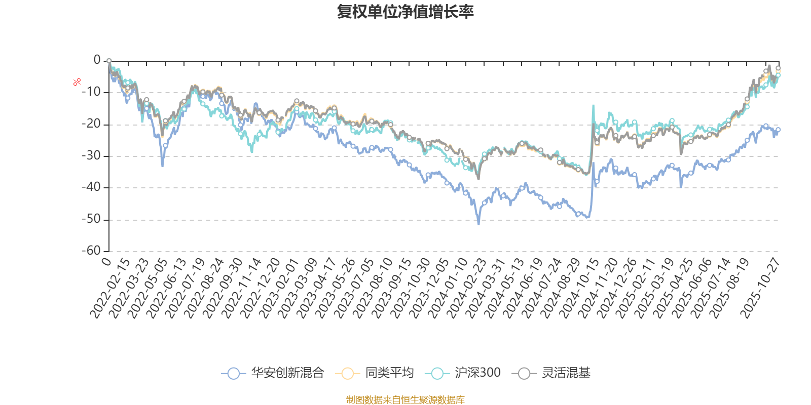 截至10月27日,华安创新混合近三个月复权单位净值增长率为10.88%,位于同类可比基金707/1287;近半年复权单位净值增长率为21.12%,位于同类可比基金729/1287;近一年复权单位净值增长率为18.51%,位于同类可比基金735/1287;近三年复权单位净值增长率为-5.00%,位于同类可比基金1068/1286。