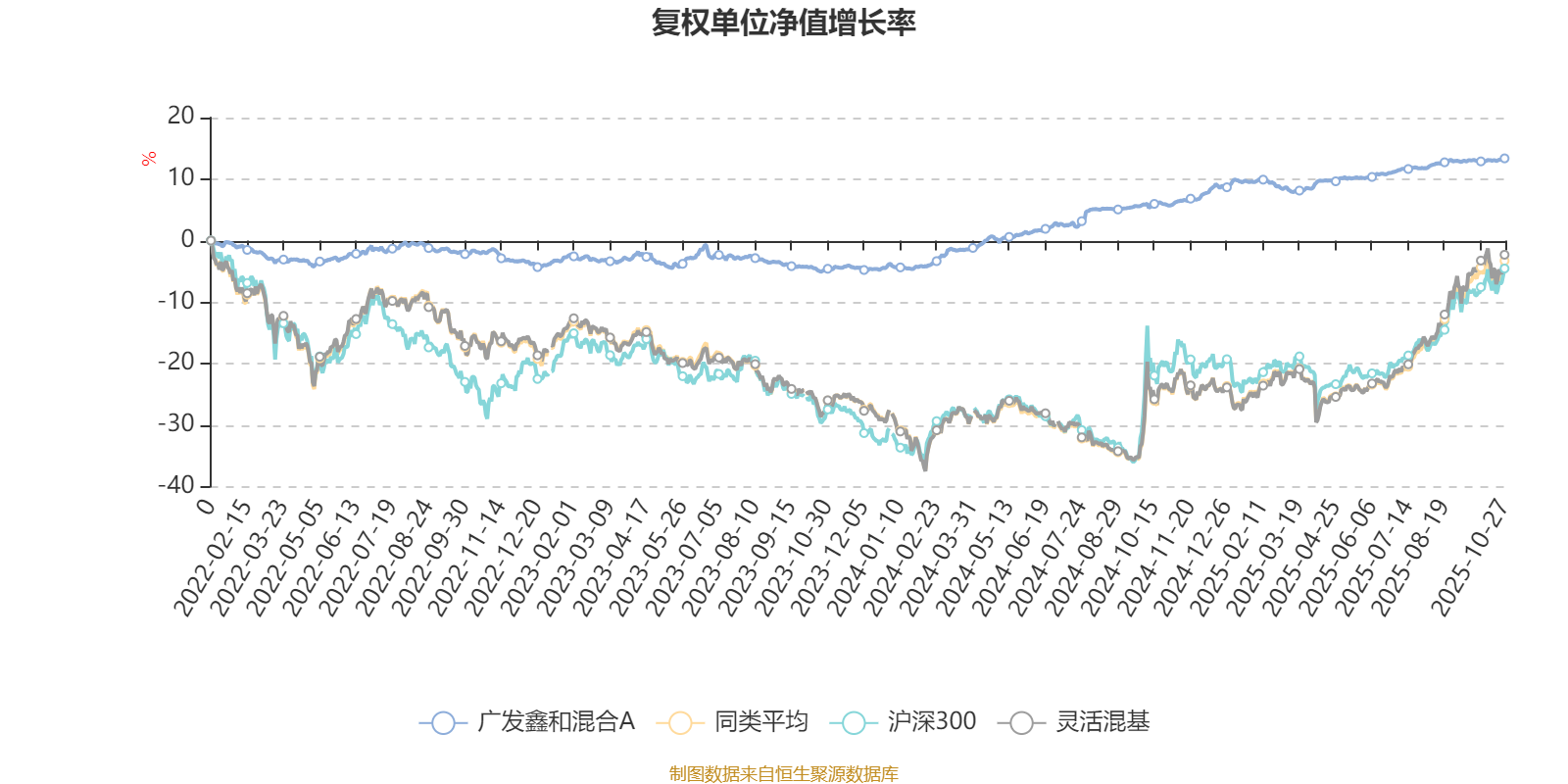 截至10月27日,广发鑫和混合A近三个月复权单位净值增长率为1.46%,位于同类可比基金1148/1287;近半年复权单位净值增长率为3.40%,位于同类可比基金1195/1287;近一年复权单位净值增长率为7.05%,位于同类可比基金1061/1287;近三年复权单位净值增长率为15.59%,位于同类可比基金624/1286。