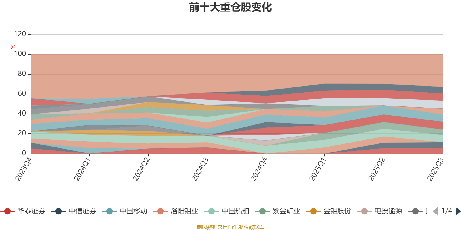 该基金持股集中度较高。截至2025年三季度末,基金十大重仓股分别是中国银河、天山铝业、中国太保、中国人保、中国船舶、云铝股份、中国铝业、华泰证券、紫金矿业、中信证券。