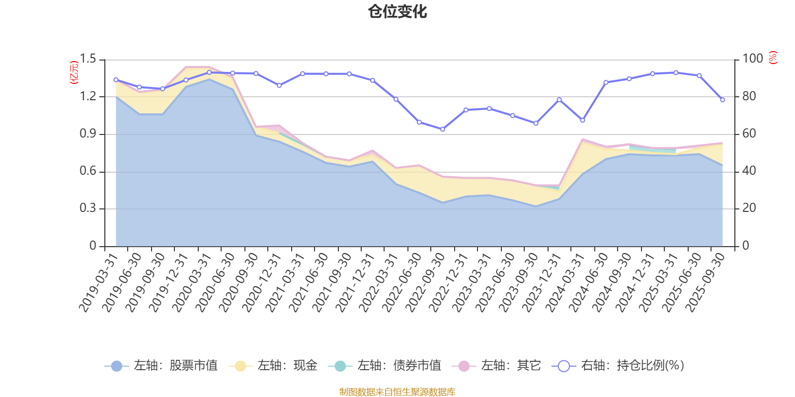 据定期报告数据统计,近三年平均股票仓位为80.14%,同类平均为72.35%。2020年一季度末基金达到93.11%的最高仓位,2022年三季度末最低,为62.72%。