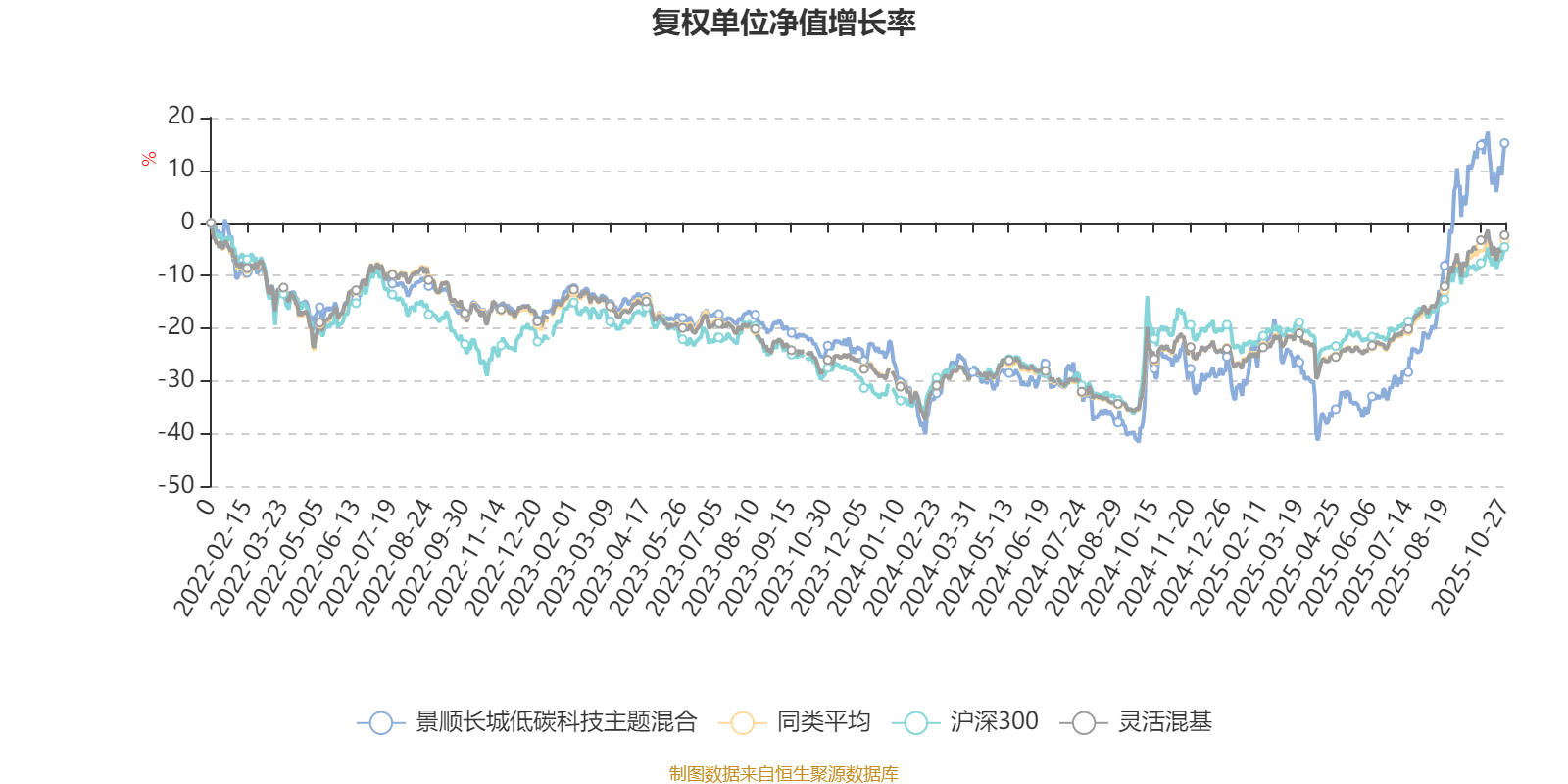 截至10月27日,景顺长城低碳科技主题混合近三个月复权单位净值增长率为51.97%,位于同类可比基金41/1287;近半年复权单位净值增长率为77.96%,位于同类可比基金48/1287;近一年复权单位净值增长率为53.66%,位于同类可比基金132/1287;近三年复权单位净值增长率为38.07%,位于同类可比基金238/1286。