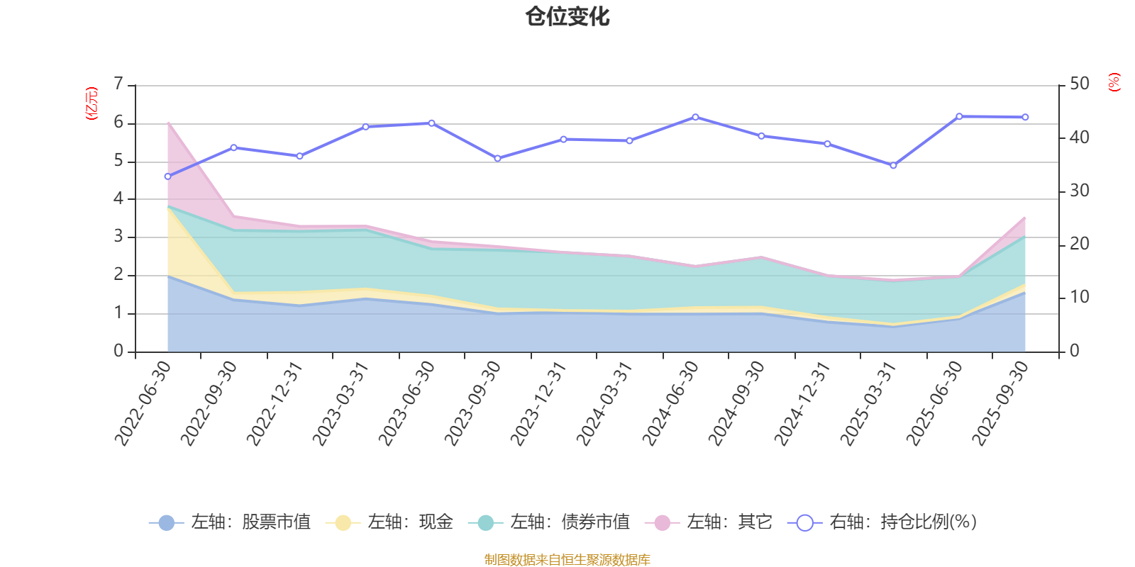 据定期报告数据统计,近三年平均股票仓位为40.33%,同类平均为19.14%。2025年上半年末基金达到44.13%的最高仓位,2022年上半年末最低,为32.88%。