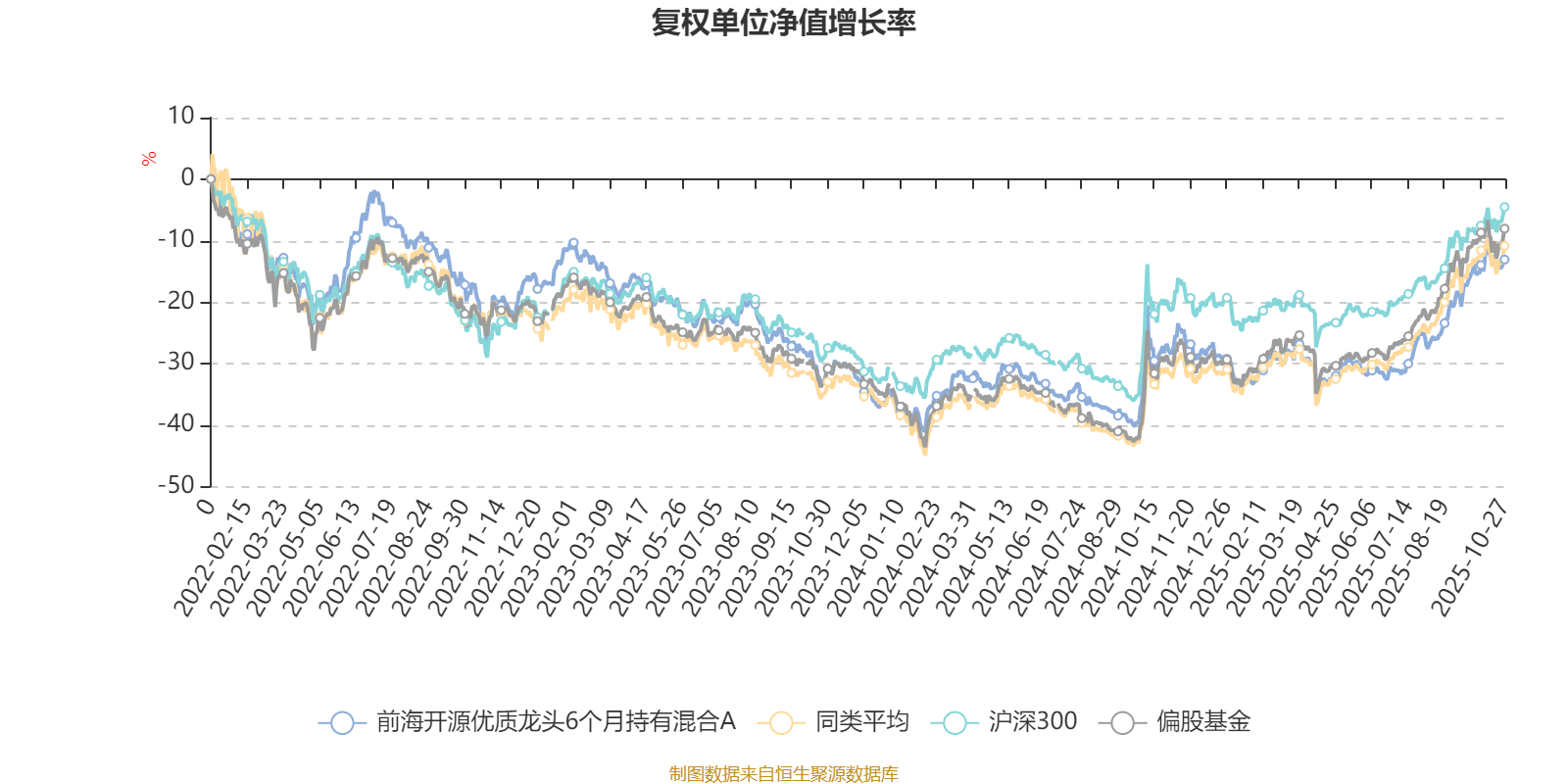 截至10月27日,前海开源优质龙头6个月持有混合A近三个月复权单位净值增长率为16.46%,位于同类可比基金120/265;近半年复权单位净值增长率为27.81%,位于同类可比基金146/265;近一年复权单位净值增长率为19.45%,位于同类可比基金189/265;近三年复权单位净值增长率为13.63%,位于同类可比基金150/253。