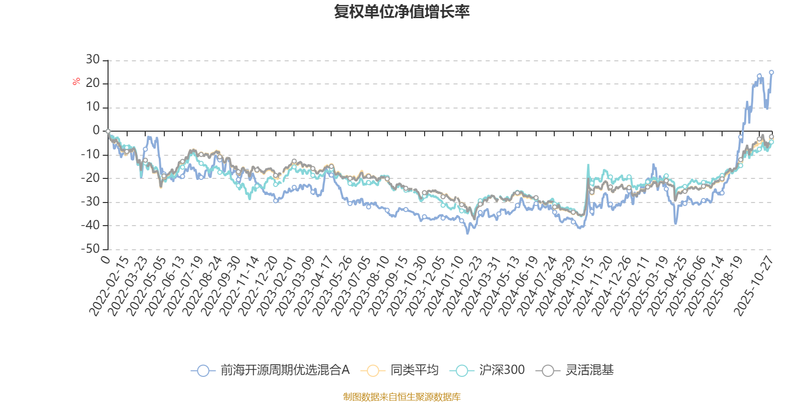 截至10月27日,前海开源周期优选混合A近三个月复权单位净值增长率为56.10%,位于同类可比基金25/1287;近半年复权单位净值增长率为79.84%,位于同类可比基金45/1287;近一年复权单位净值增长率为83.00%,位于同类可比基金35/1287;近三年复权单位净值增长率为52.26%,位于同类可比基金130/1286。