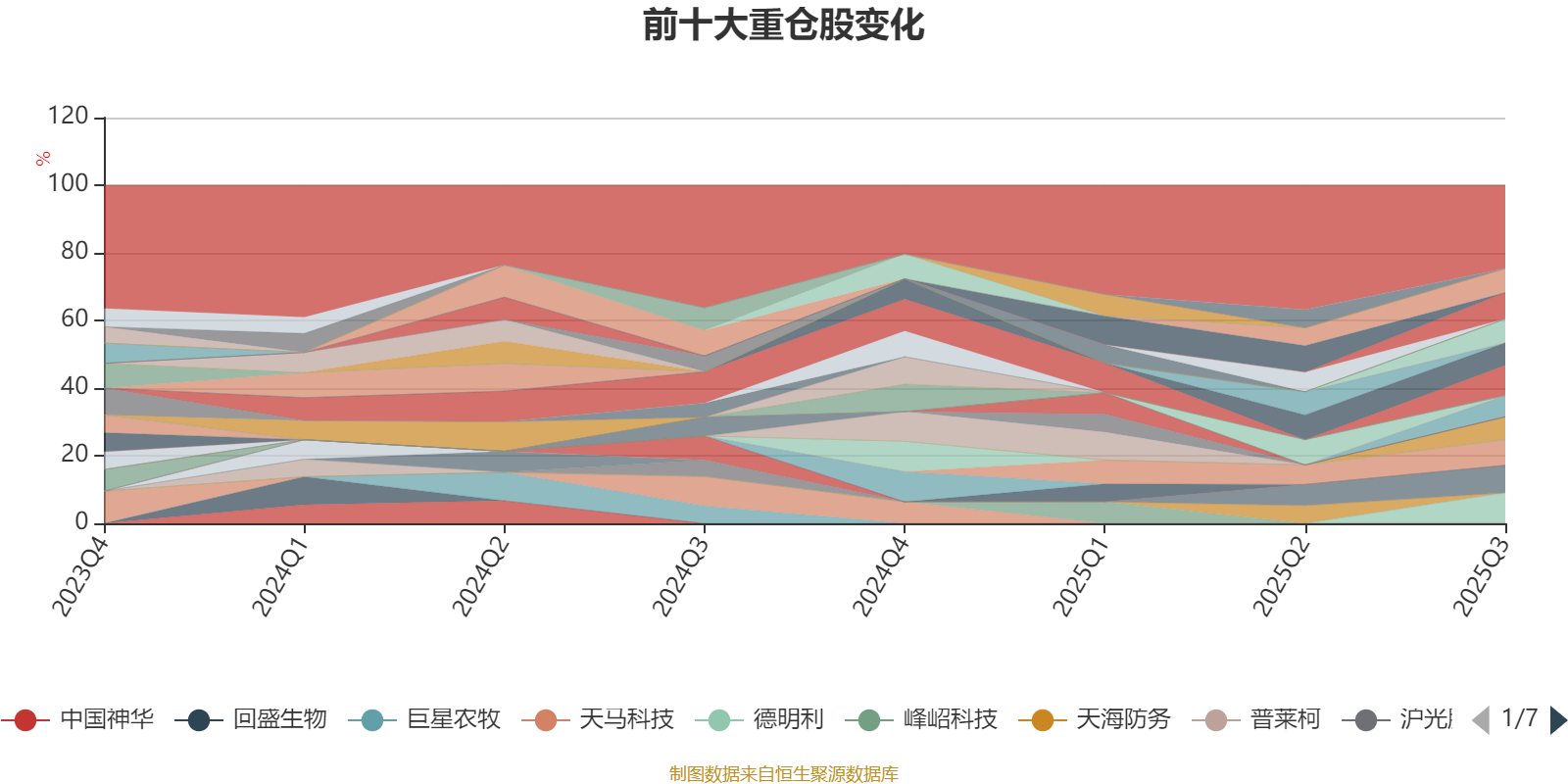 该基金持股集中度较高,近2年前十大重仓股集中度长期超过60%。截至2025年三季度末,基金十大重仓股分别是德明利、寒武纪、中际旭创、工业富联、精智达、新易盛、瑞可达、ST华通、指南针、杰普特。