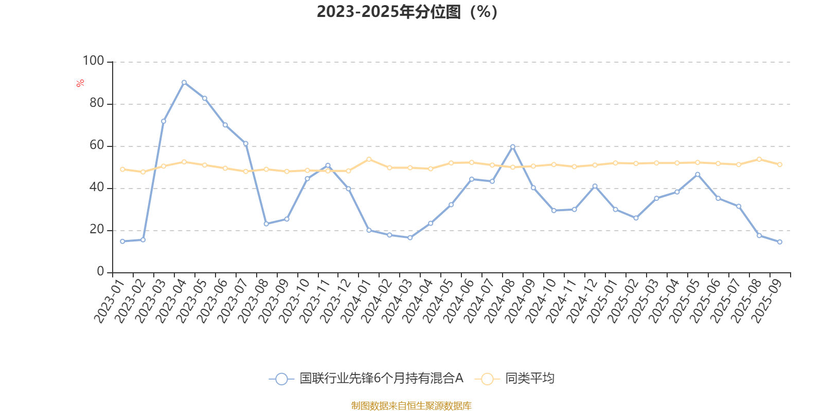 通过所选区间该基金净值增长率分位图,可以观察该基金与同类基金业绩比较情况。图为坐标原点到区间内某时点的净值增长率在同类基金中的分位数。