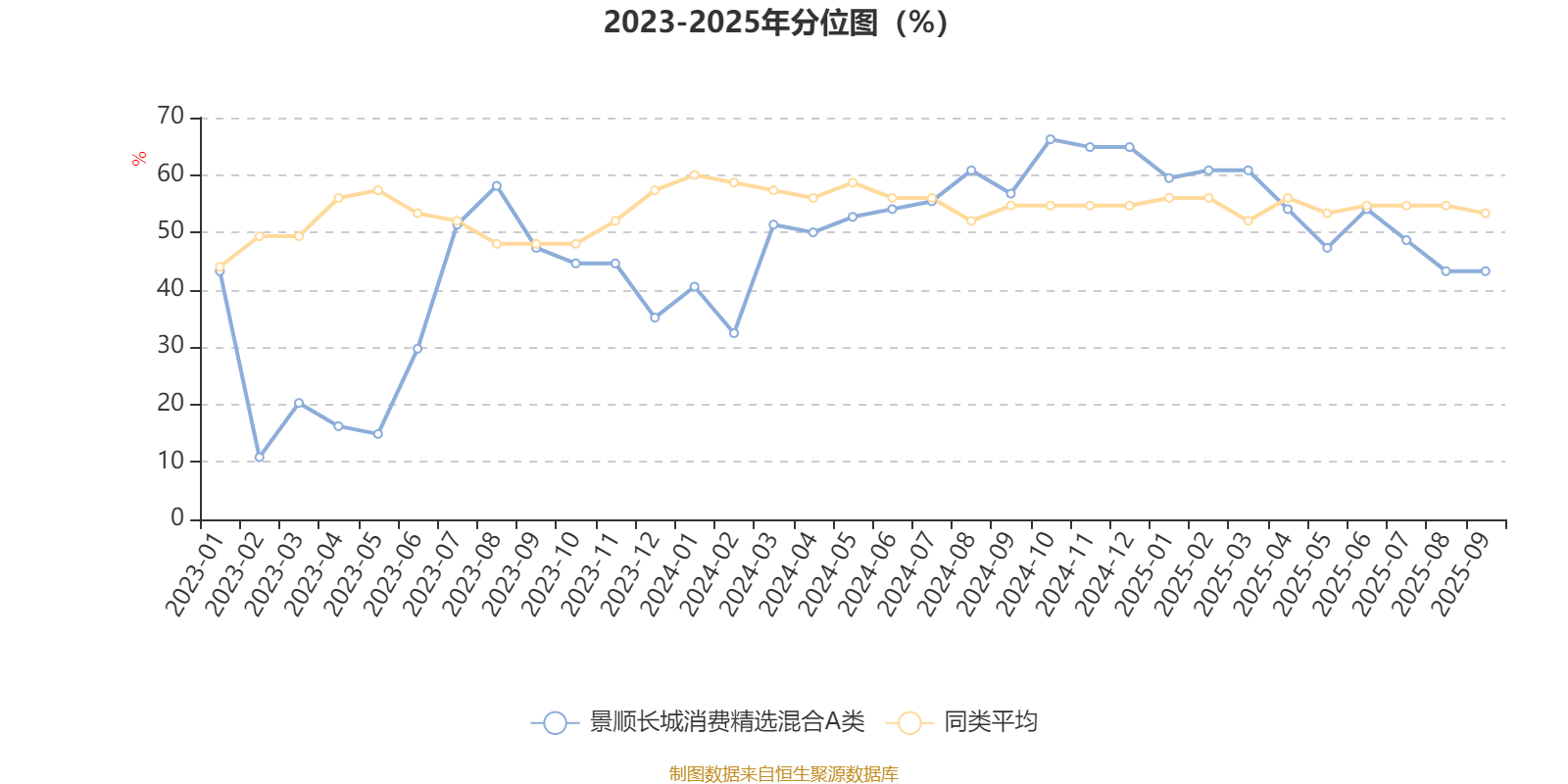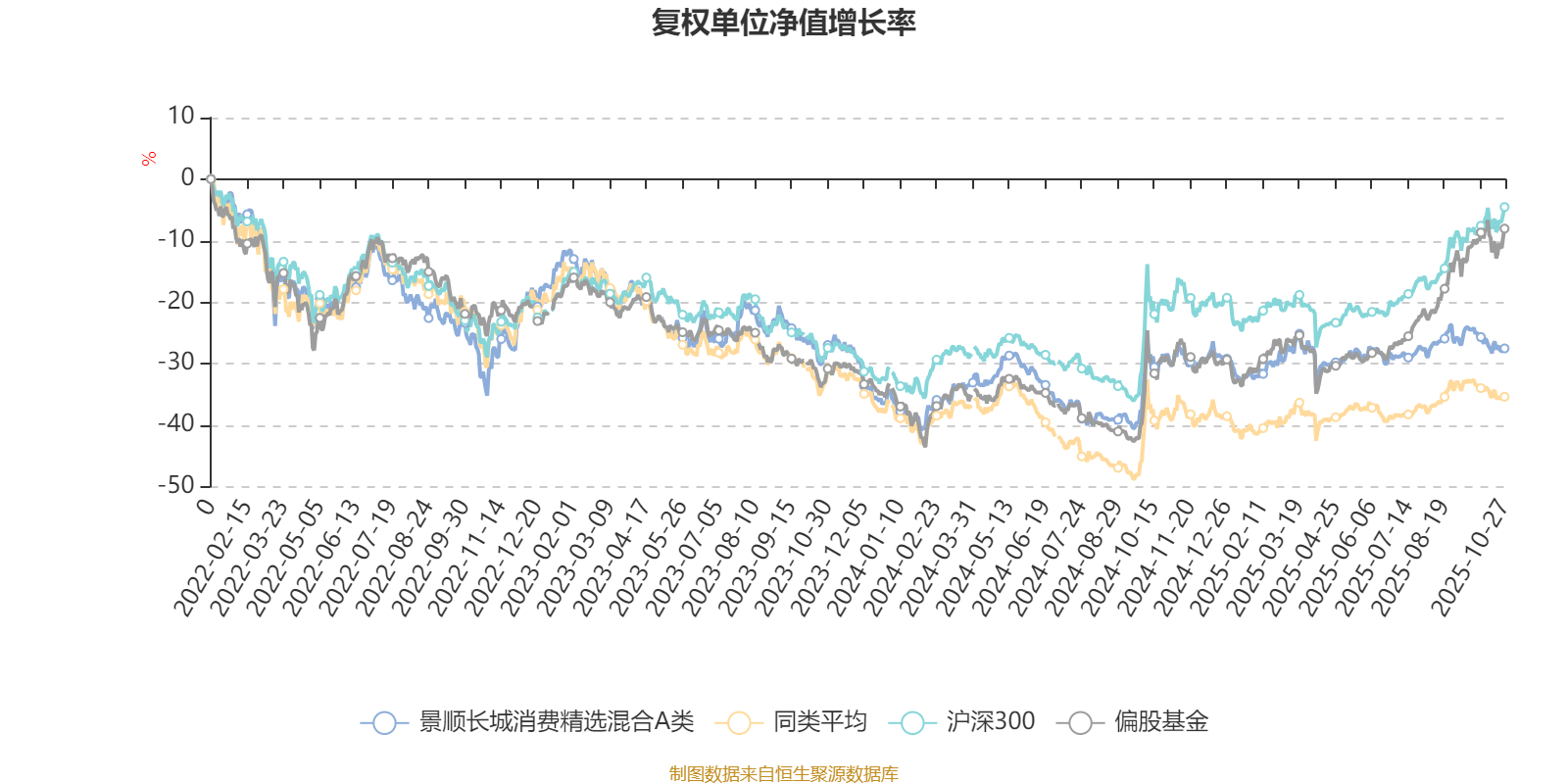 截至10月27日,景顺长城消费精选混合A类近三个月复权单位净值增长率为-0.22%,位于同类可比基金57/85;近半年复权单位净值增长率为3.23%,位于同类可比基金60/85;近一年复权单位净值增长率为2.40%,位于同类可比基金54/82;近三年复权单位净值增长率为7.85%,位于同类可比基金24/74。