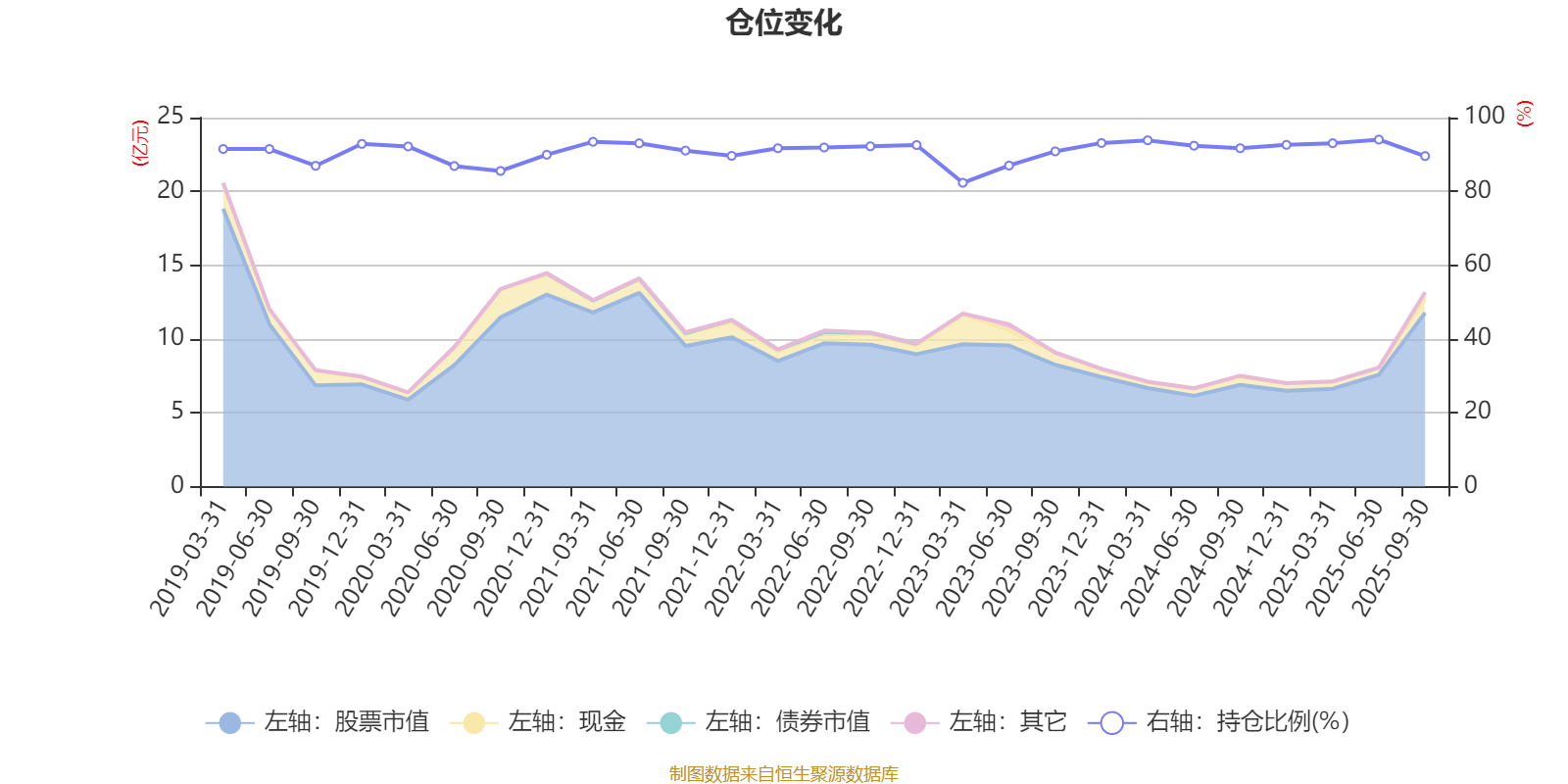 据定期报告数据统计,近三年平均股票仓位为91.09%,同类平均为85.99%。2025年上半年末基金达到94.04%的最高仓位,2023年一季度末最低,为82.33%。
