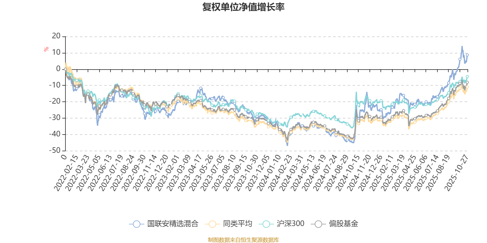 截至10月27日,国联安精选混合近三个月复权单位净值增长率为24.06%,位于同类可比基金70/265;近半年复权单位净值增长率为38.46%,位于同类可比基金73/265;近一年复权单位净值增长率为44.74%,位于同类可比基金53/265;近三年复权单位净值增长率为47.93%,位于同类可比基金31/253。